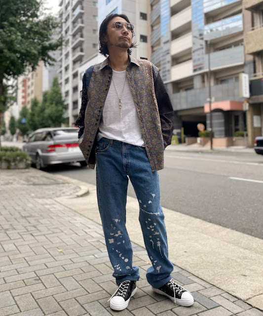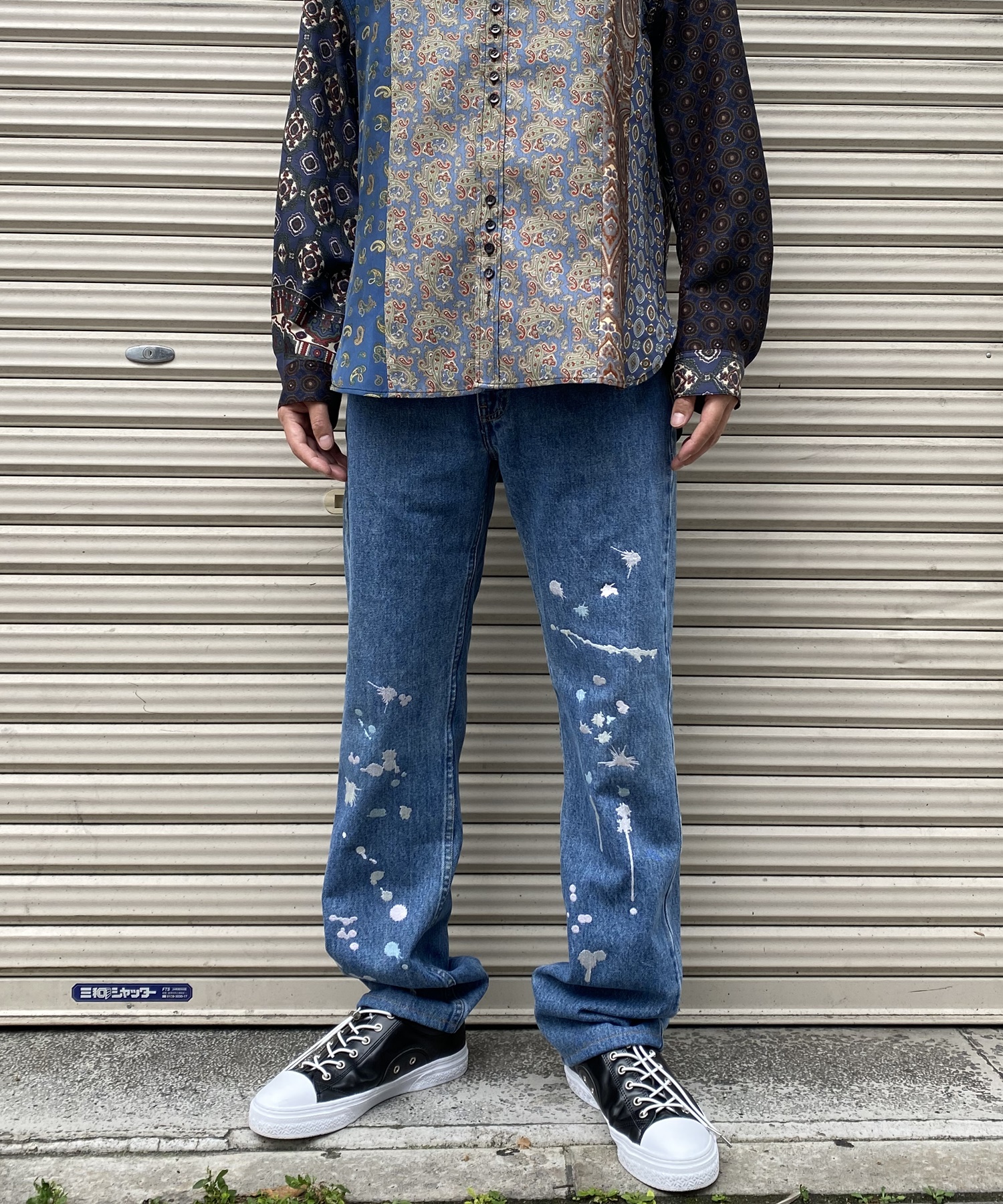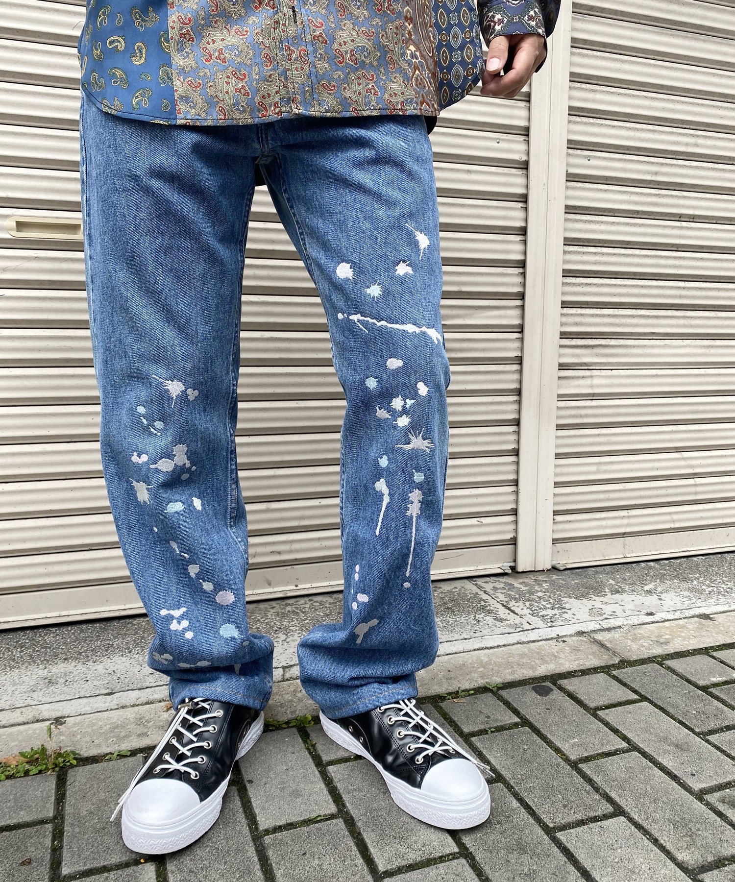MADE IN USAのユーズドLEVI'S 505に、ペンキをとばしたようなペンキ跡を刺繍で表現。
