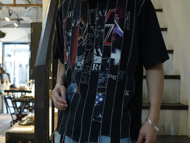 今回のリメイクは数種類のusedバンドteeをシュレッダーをかけた様に縦割りに裁断し分解。