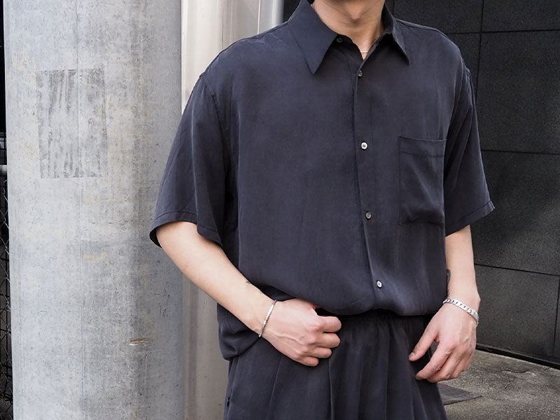 夜の海面を表現した、ヴィンテージ感のあるシワ加工のキュプラ素材を使用したS/Sシャツとワイドパンツ。