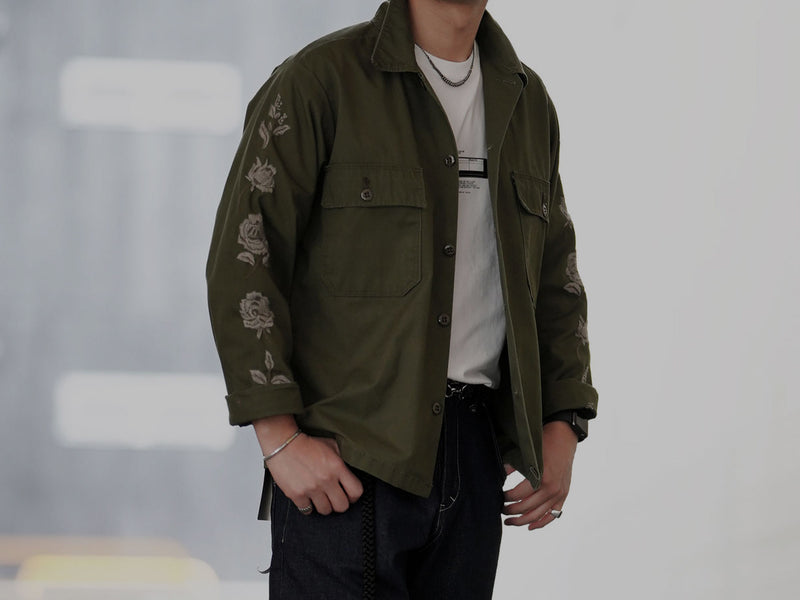 GARROT別注モデルではミリタリーシャツに見られるワッペンやテープをそのまま活かし、