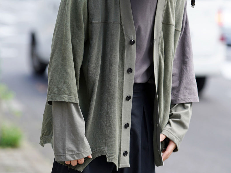 袖はレイヤード仕様で、半端丈カーディガンにロンTeeを合わせた様な見え方に。