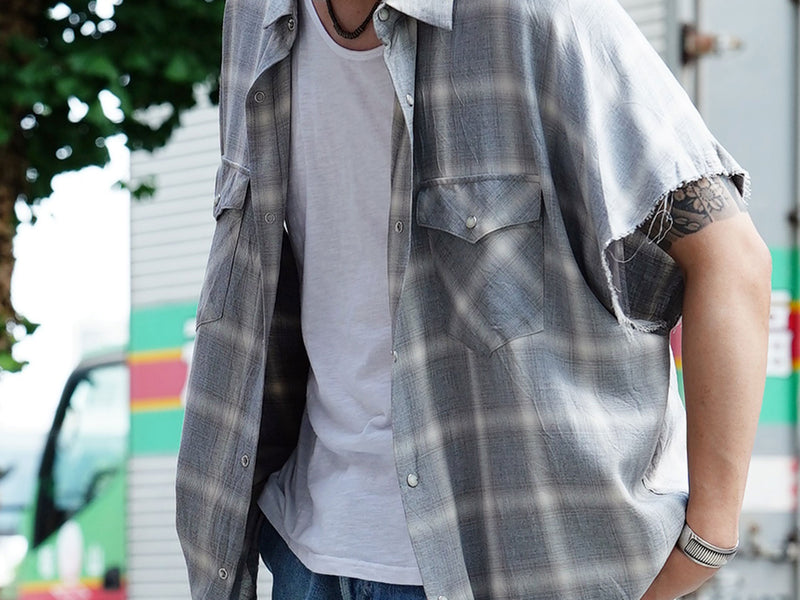 たっぷりとした身幅ながらレーヨンの落ち感はスッキリと見え、カットオフのウエスタンシャツを纏っている様。