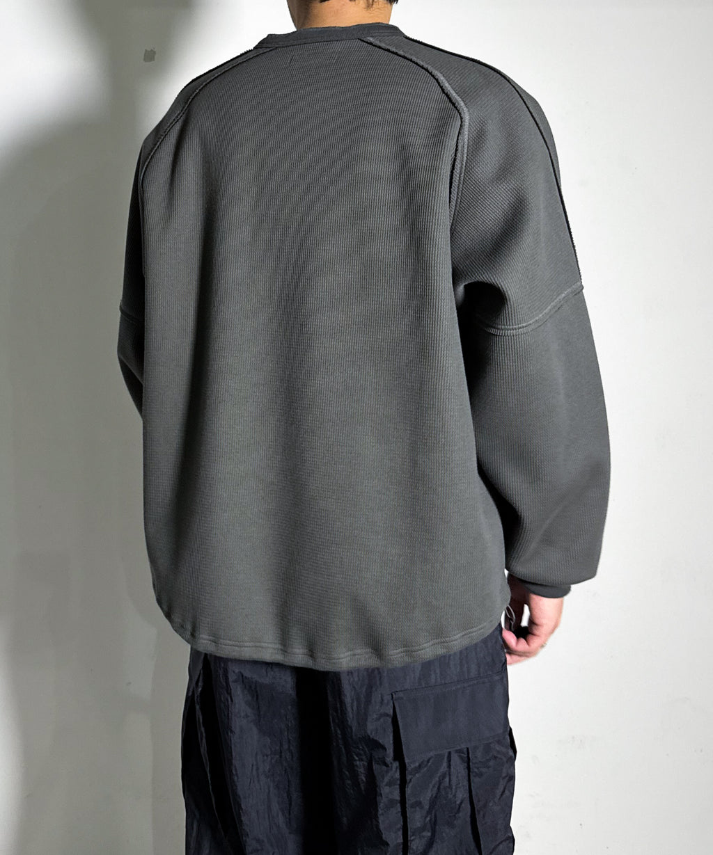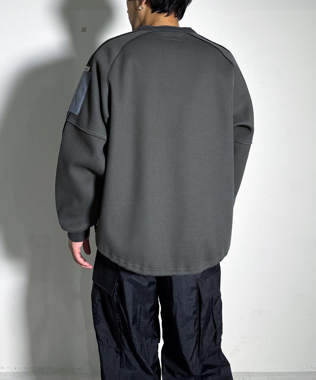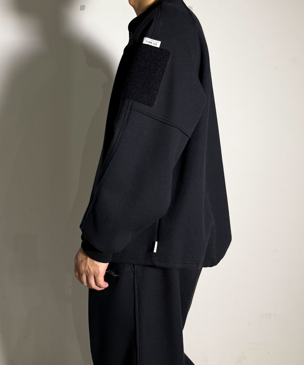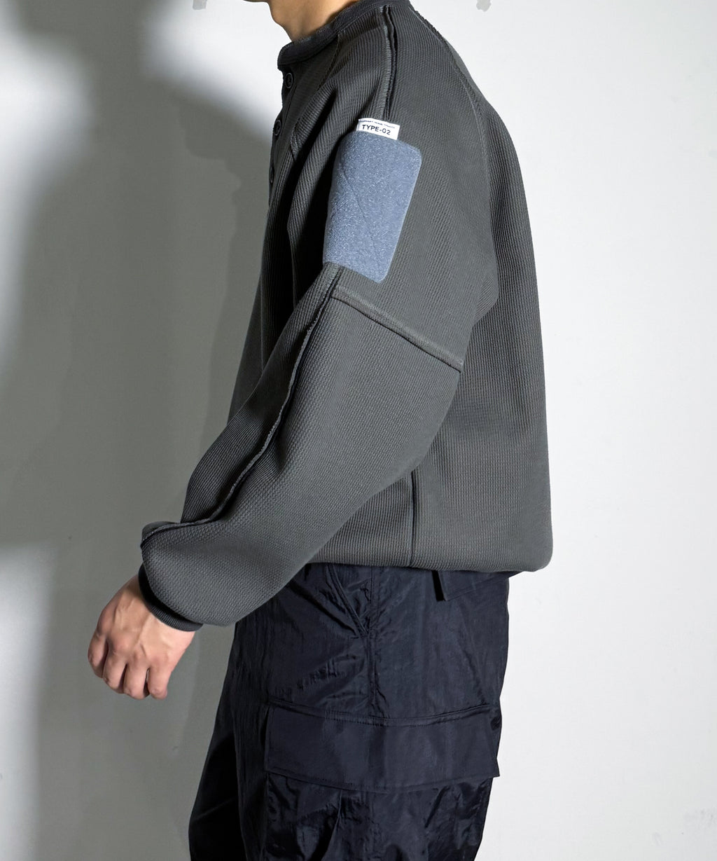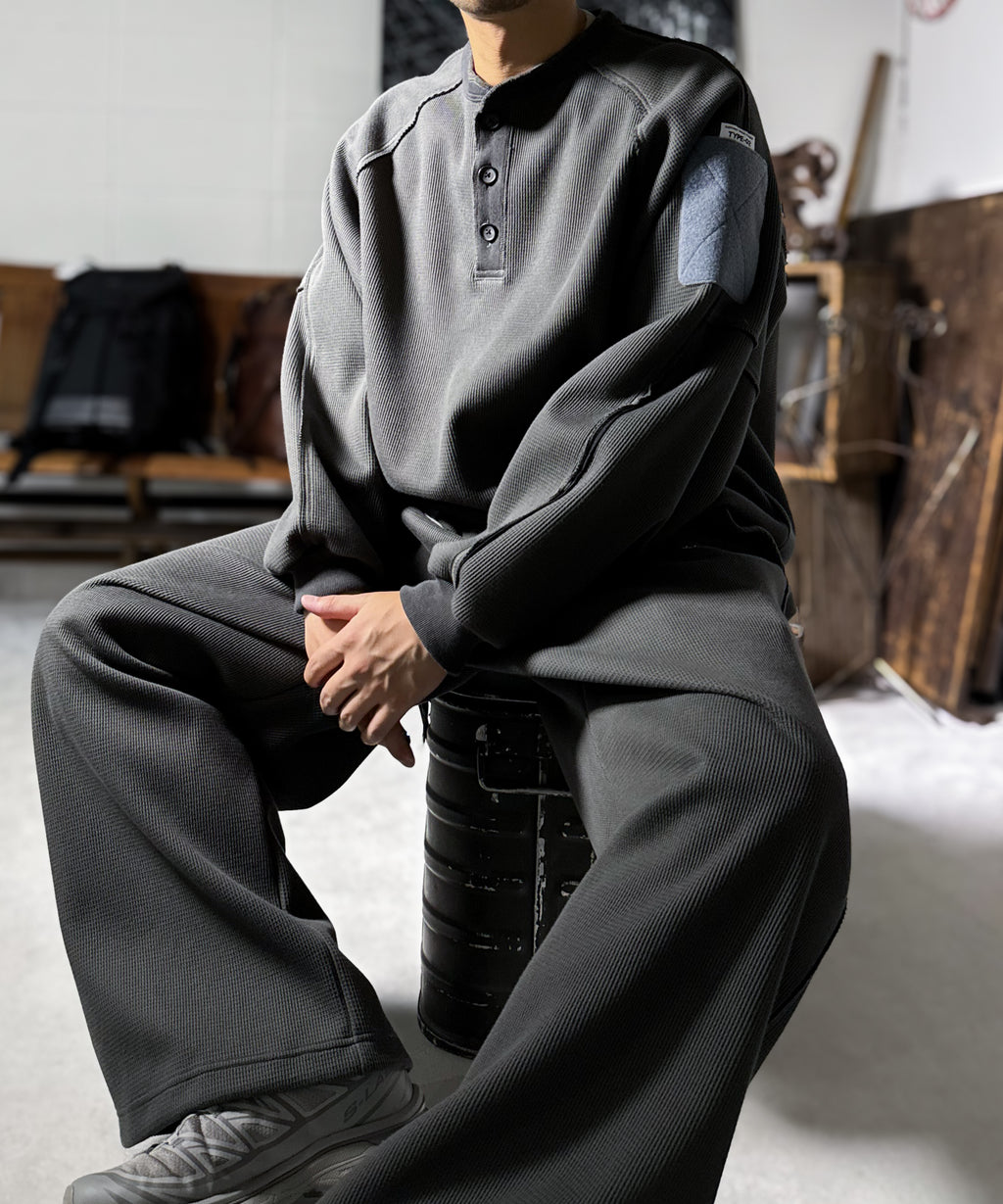 土臭く柔らかなクタっとした印象のサーマルを真逆のモダンな印象にアウトプットしたアイテム。サーマルとジャージ素材をボンディングして、柔らかくも、しっかりとしたシルエットの出るオリジナルファブリックを作成。