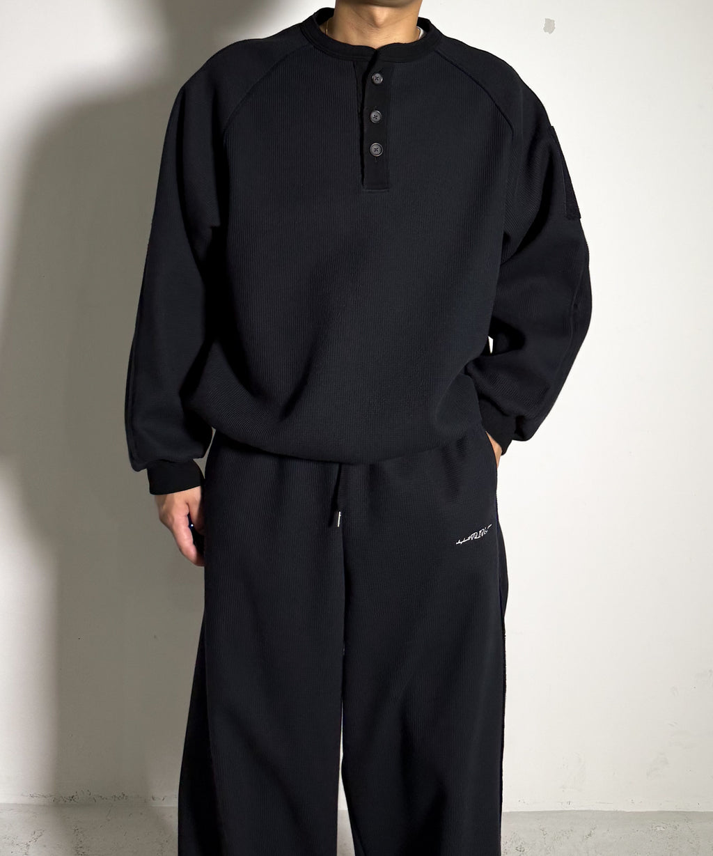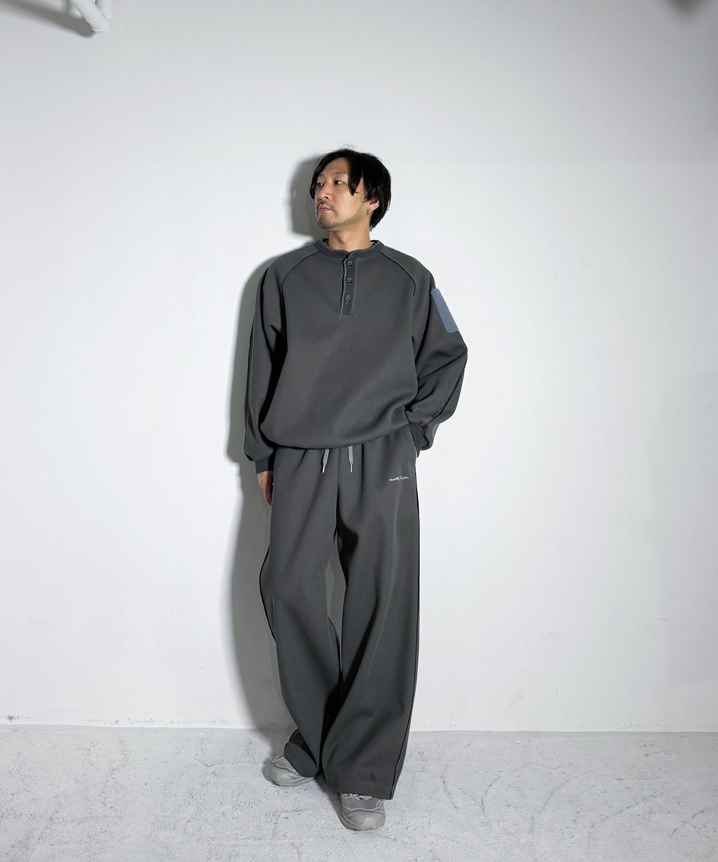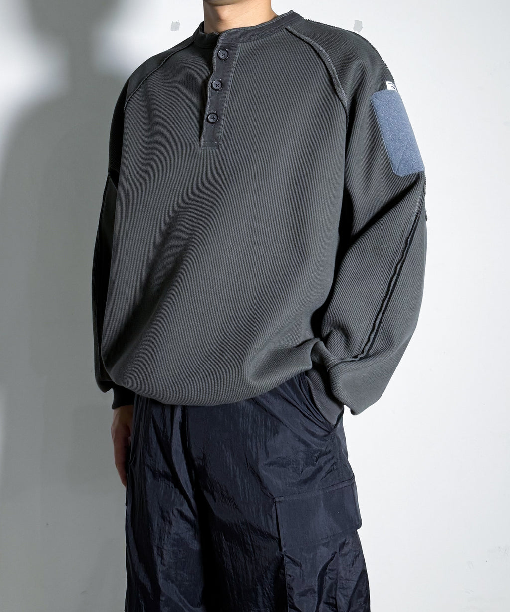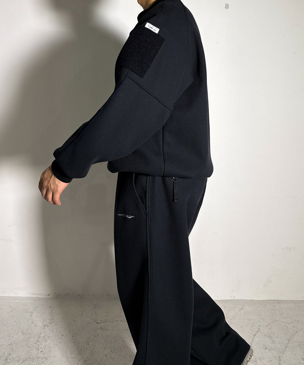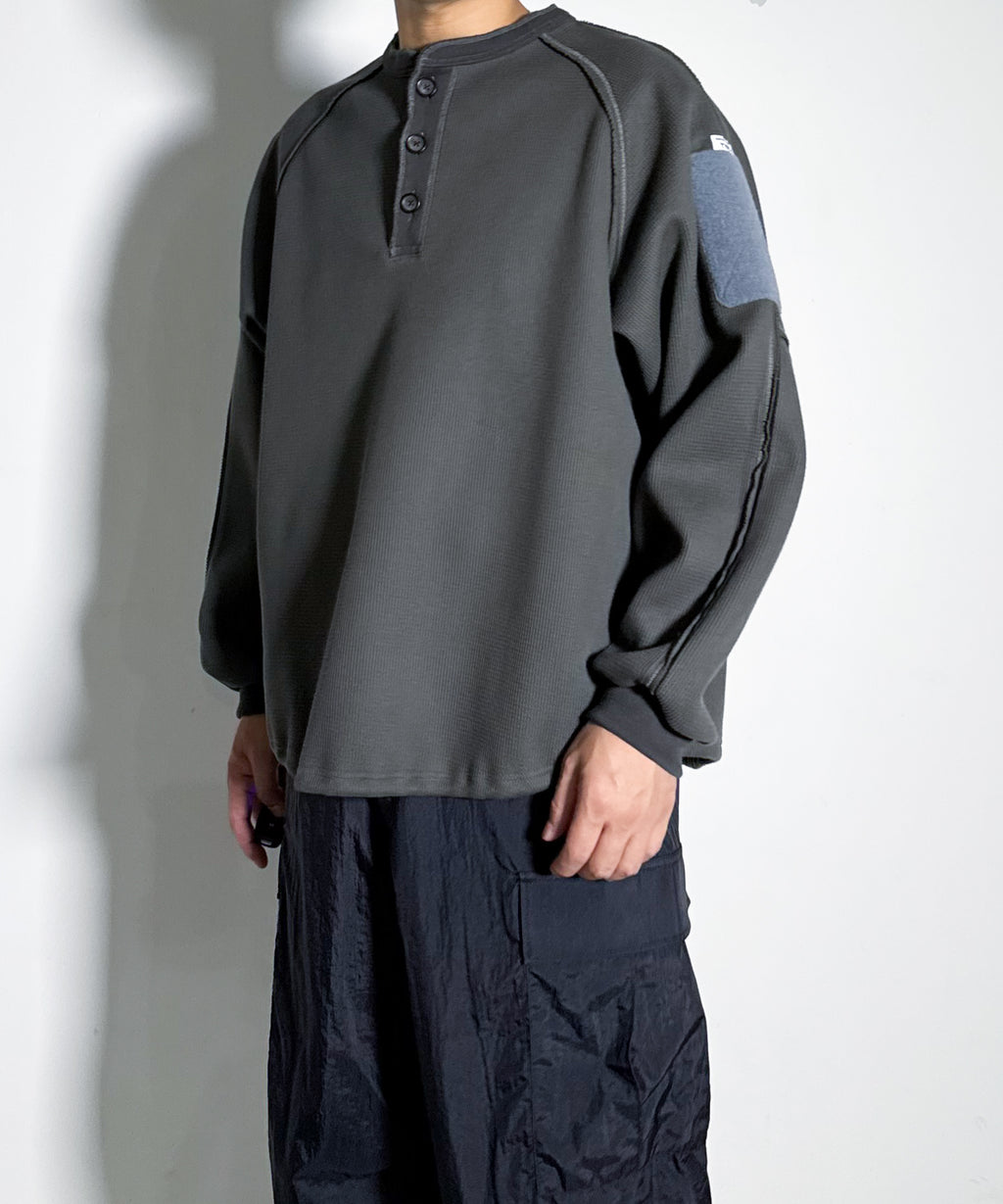 土臭く柔らかなクタっとした印象のサーマルを真逆のモダンな印象にアウトプットしたアイテム。サーマルとジャージ素材をボンディングして、柔らかくも、しっかりとしたシルエットの出るオリジナルファブリックを作成。