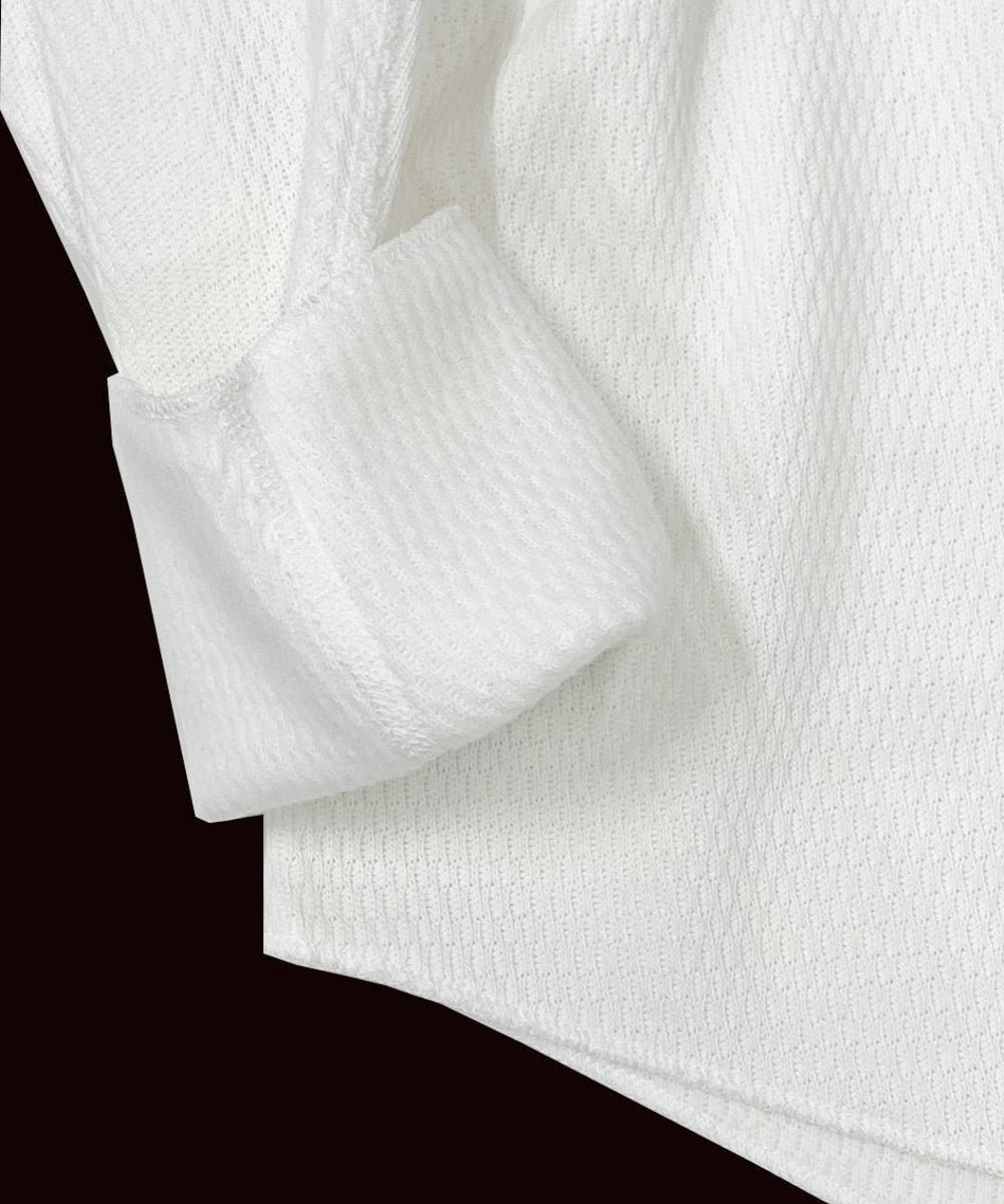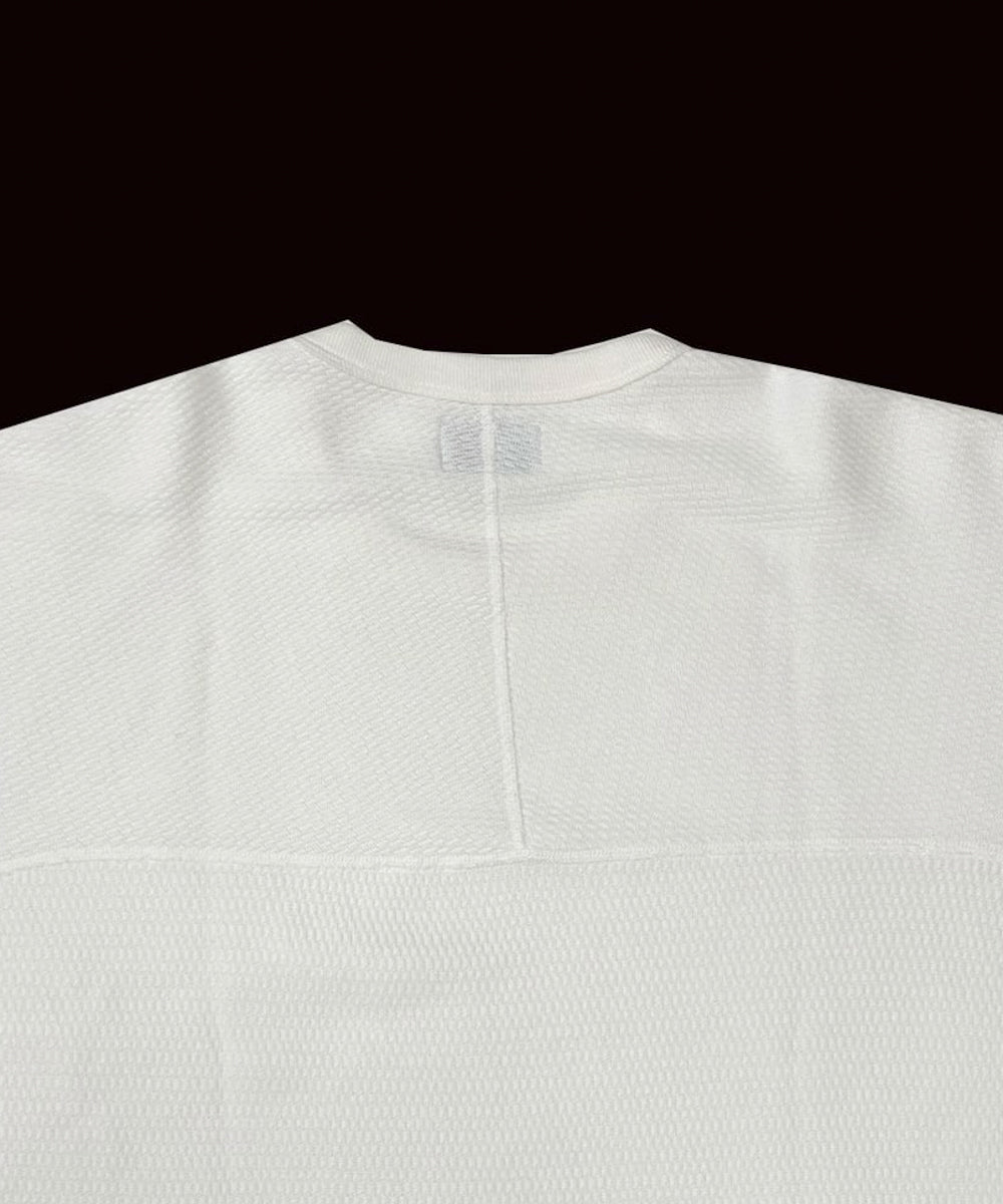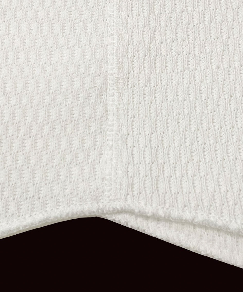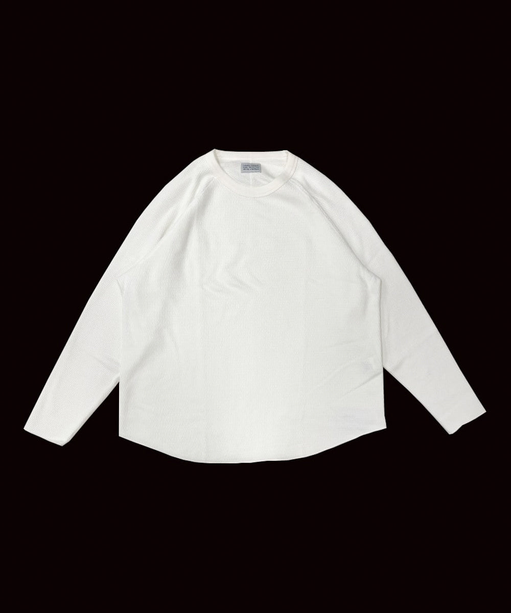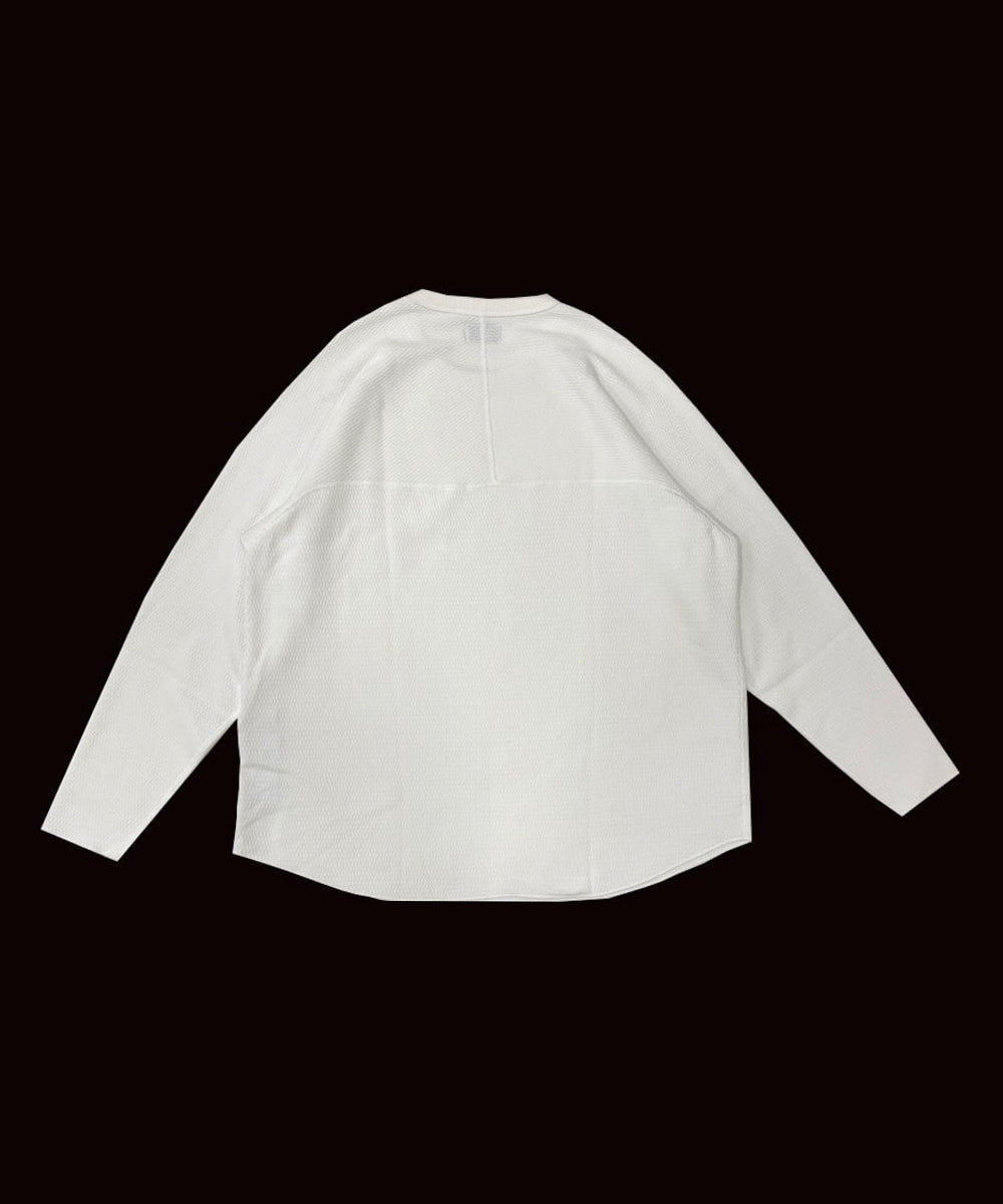 サーマル特有の凹凸感を残しながらも、驚くほど柔らかなタッチに仕上げられています。縫製にはフラットシーマを採用し、縫い代の違和感を軽減。
