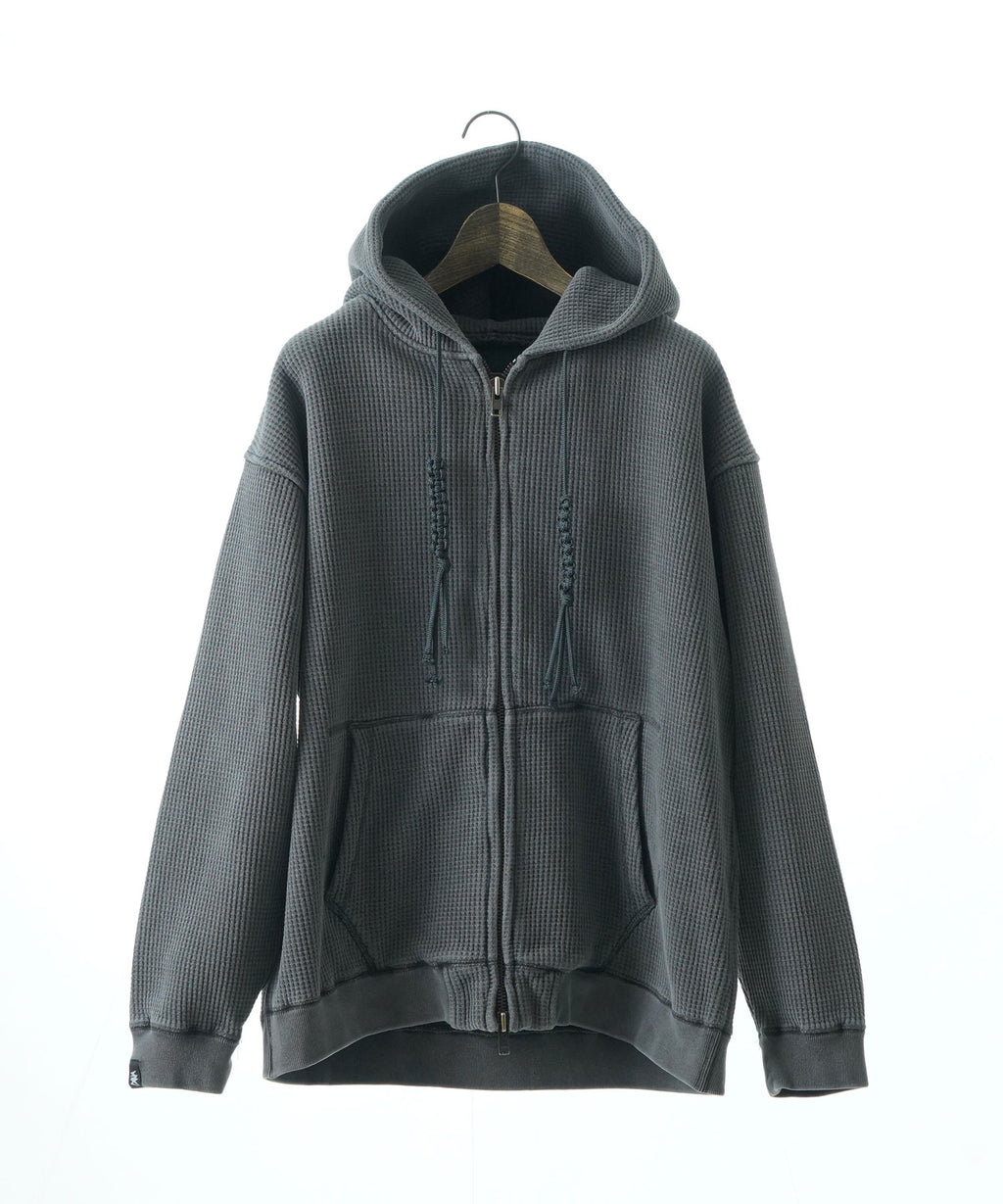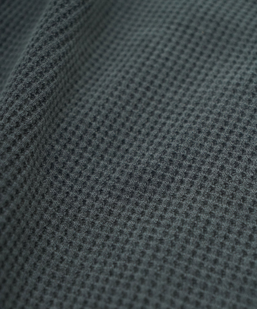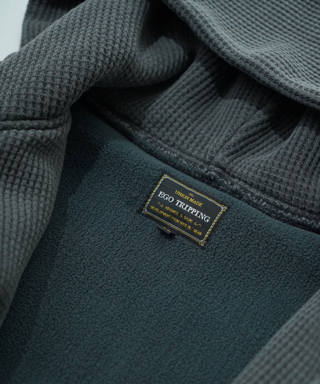 最大の特徴は、重厚感のあるヘビーオンスワッフル生地の裏側に、フェイクファーをボンディングするという革新的な素材構造。
