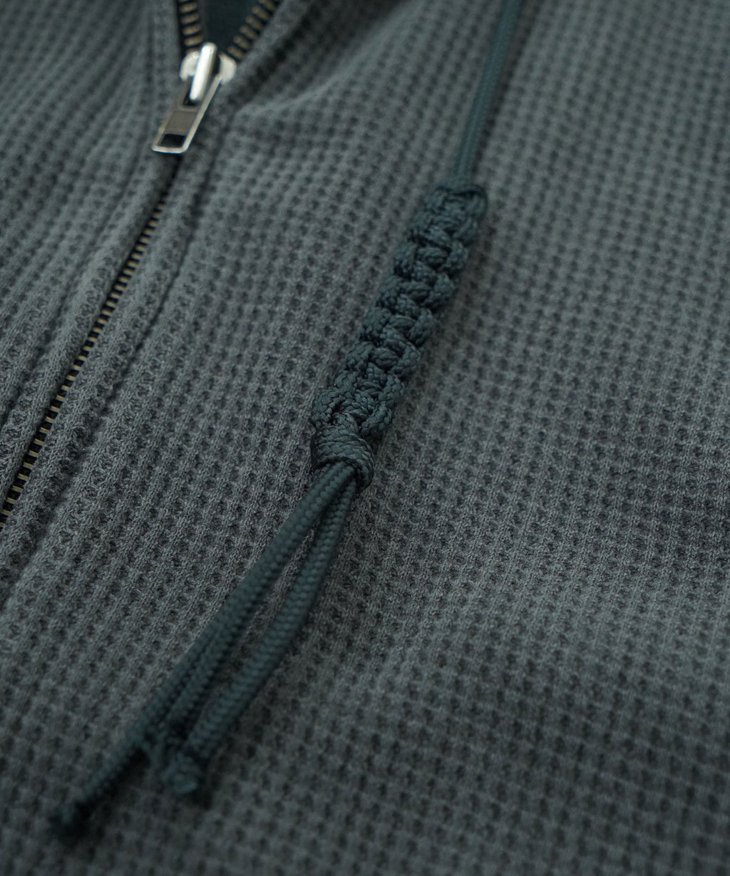 職人の手作業によって一つ一つ丁寧に編み上げられたドローコードは、カジュアルなワッフル素材に洗練されたアクセントを添えています。