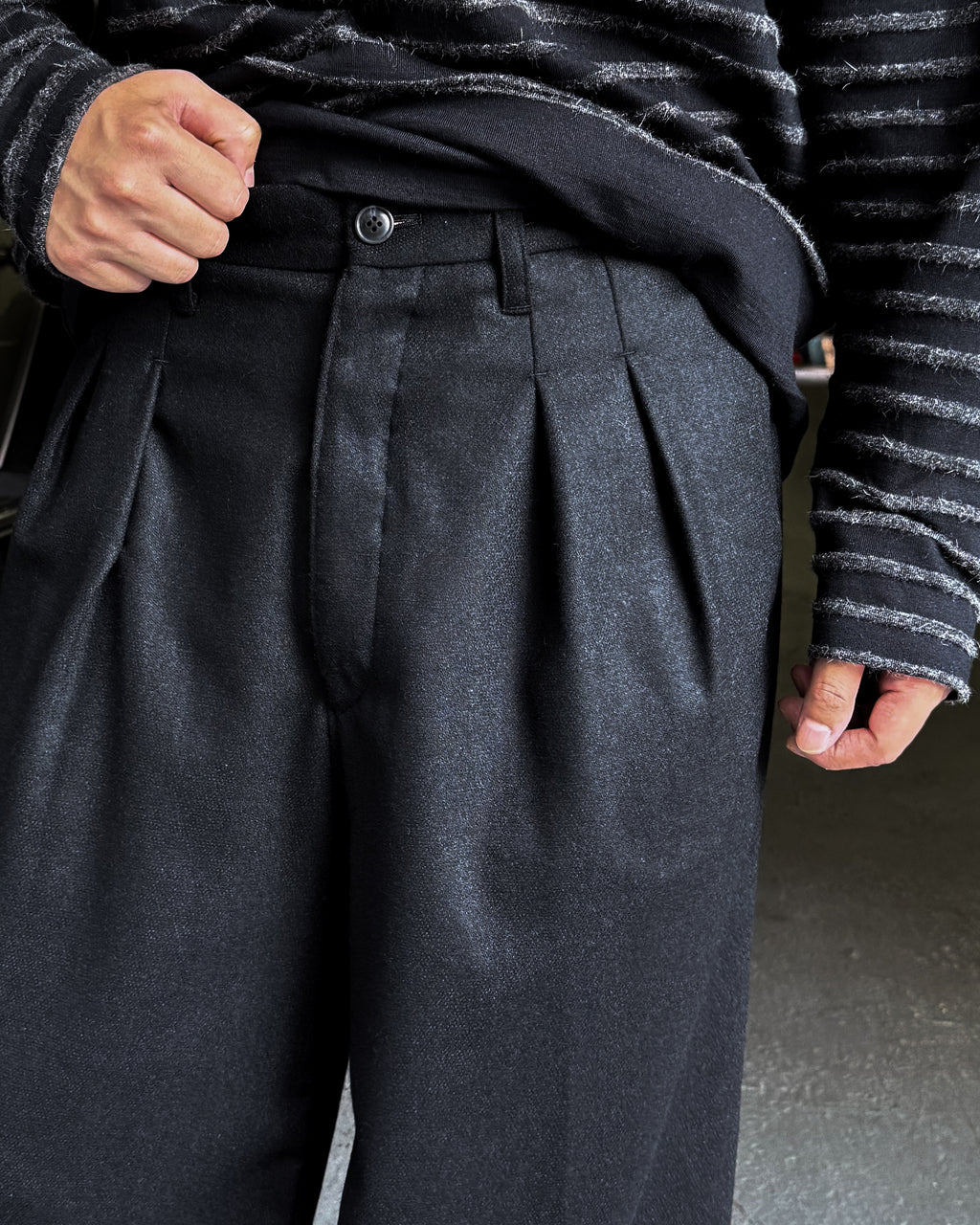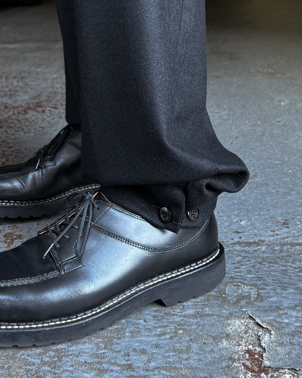 私自身、気に入ってプライベートでもよく履いている、フランスの40年代ヴィンテージトラウザーズをサンプリングした、こだわり満載のパンツです。