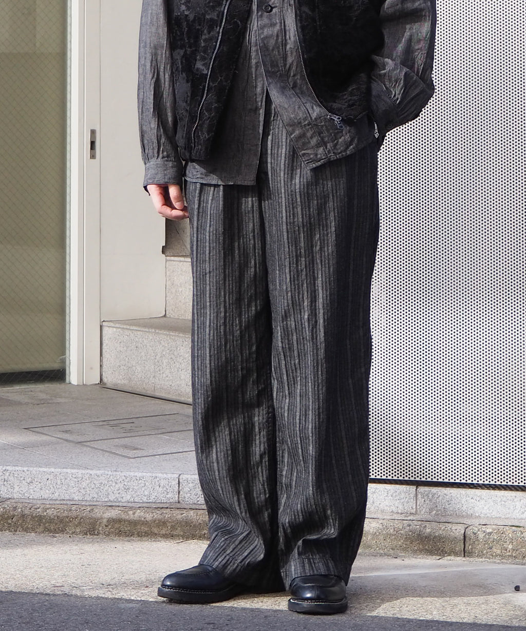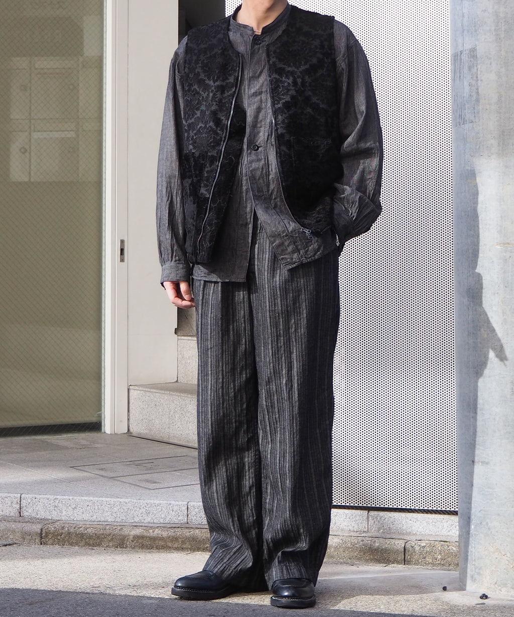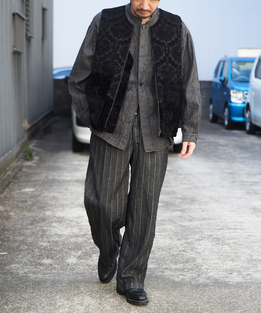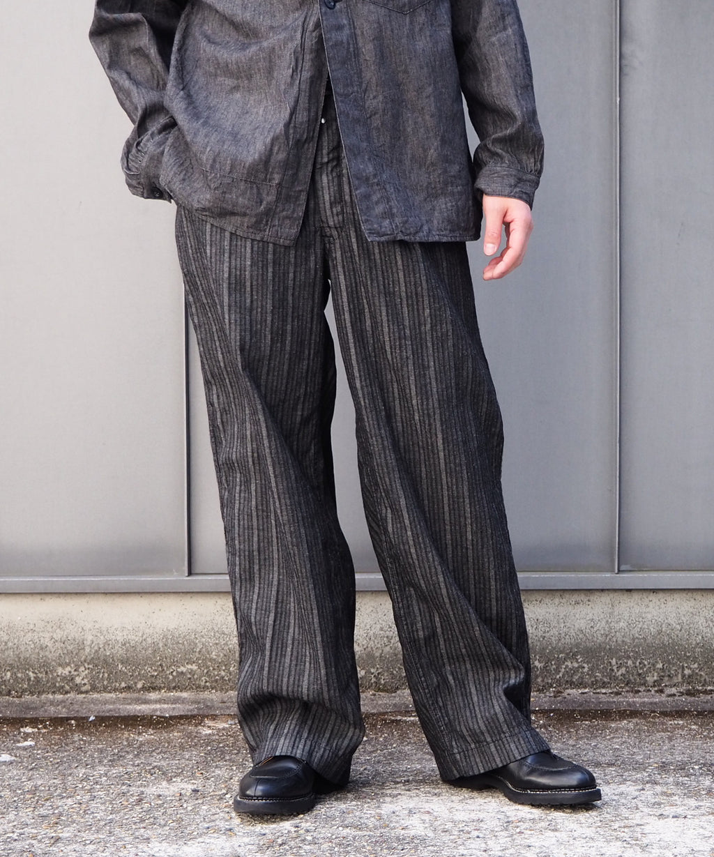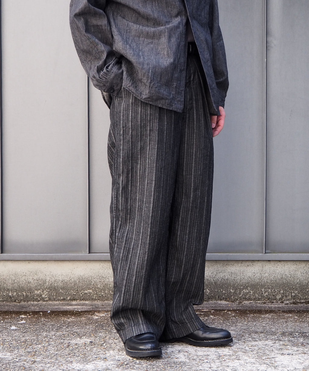 岡山のデニムの機屋で古いフランスのストライプワークパンツの素材を再現して織り上げた綾素材です。