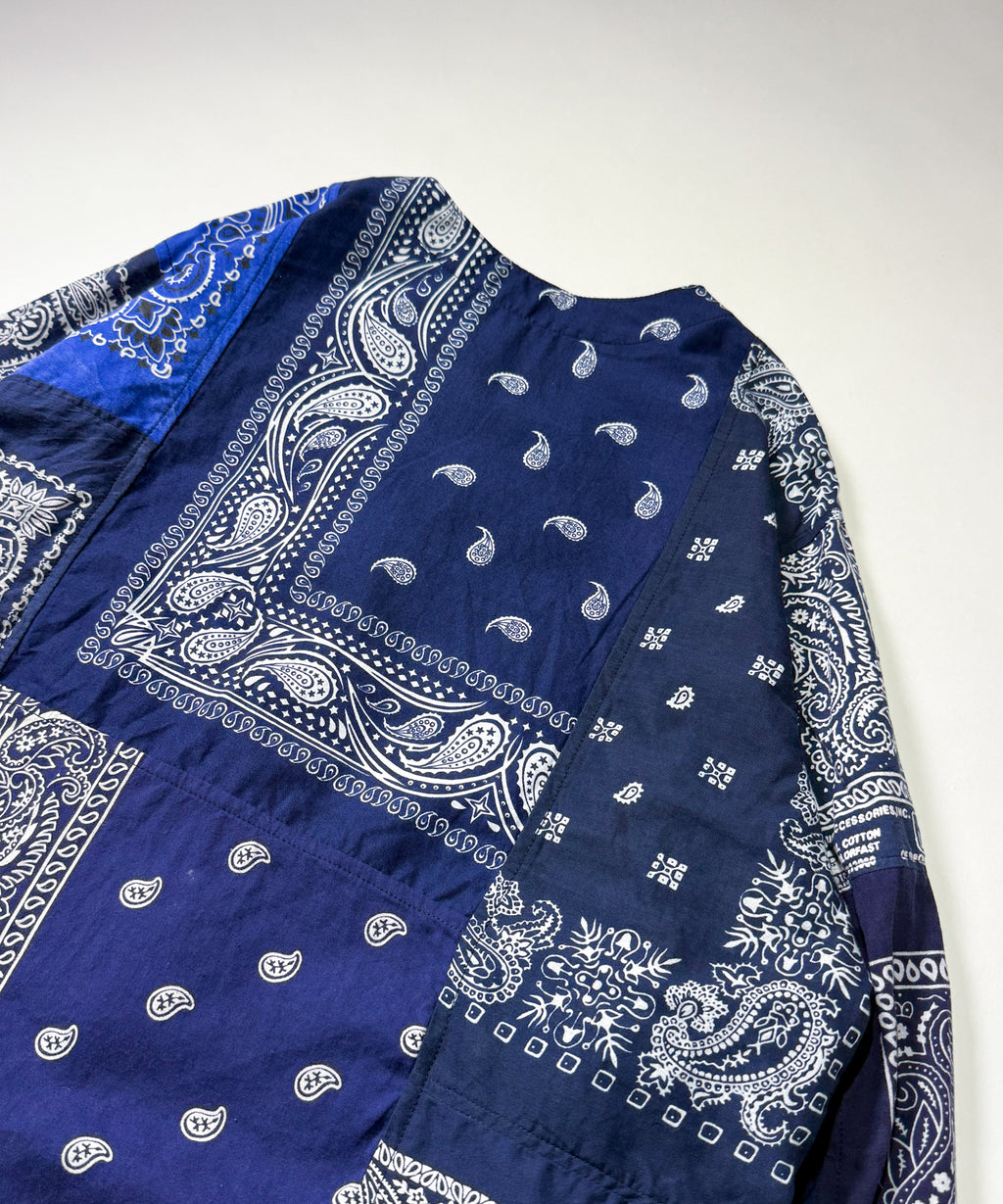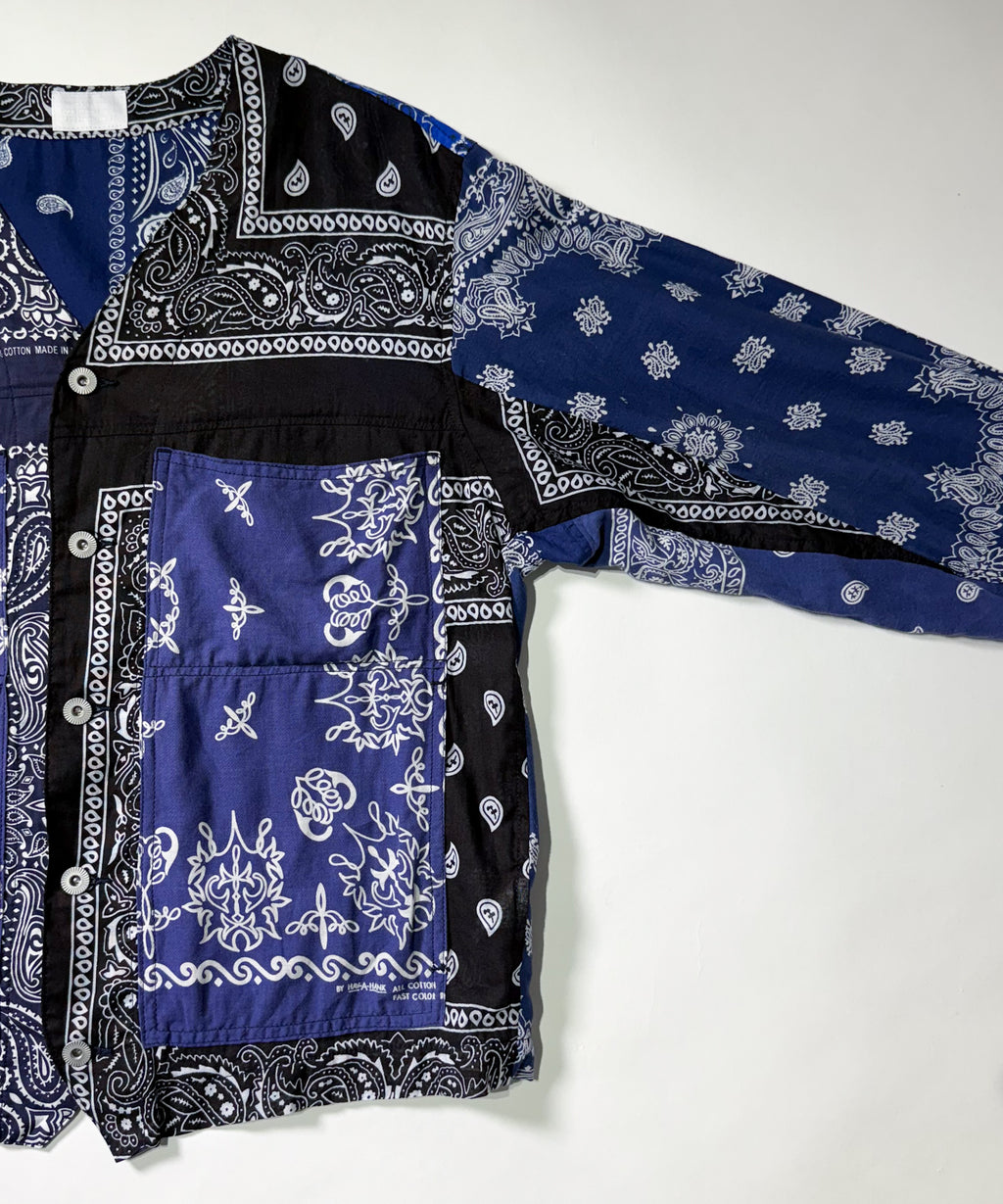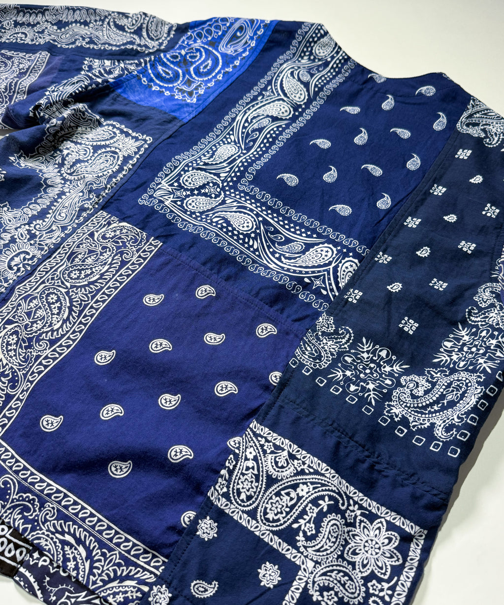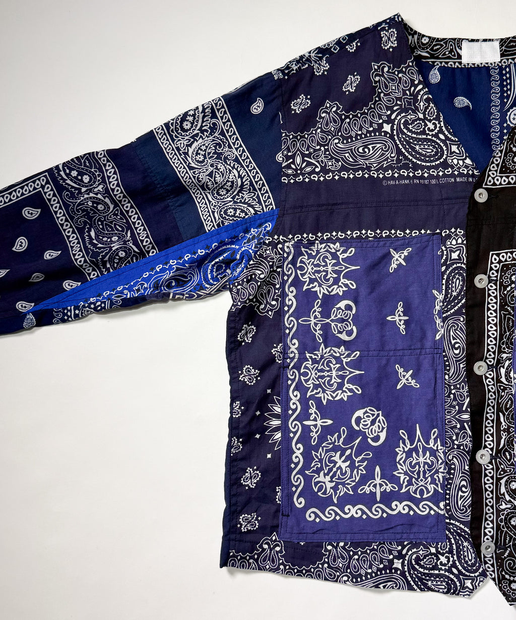 大小さまざまな柄や色味のヴィンテージバンダナを大胆に組み合わせた構成。