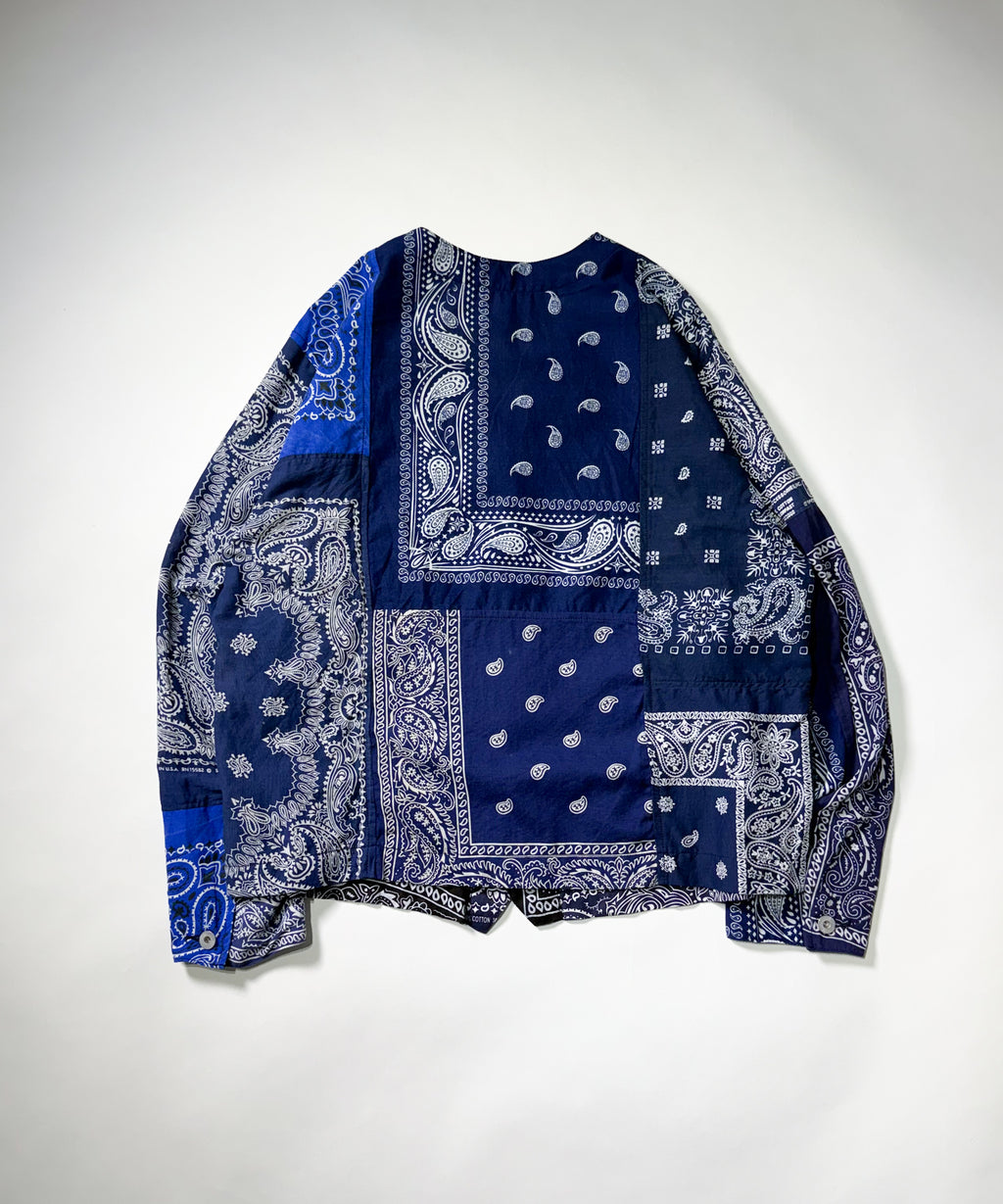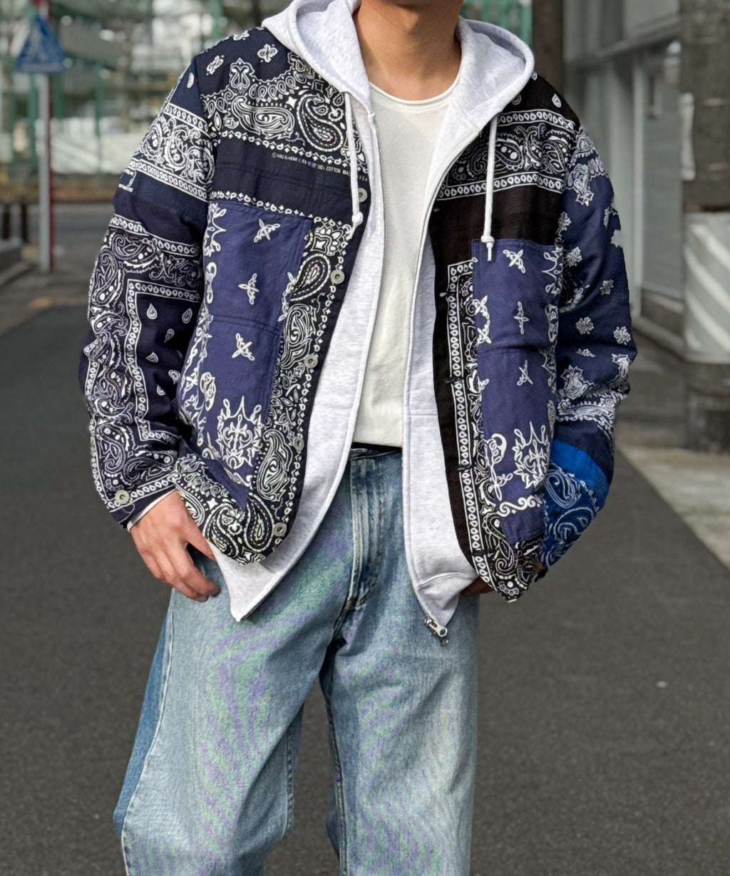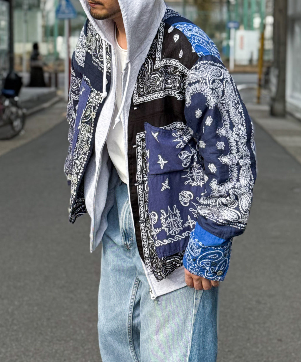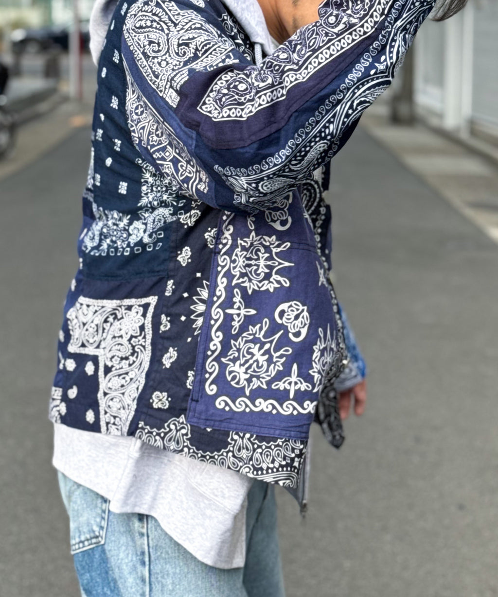 大小さまざまな柄や色味のヴィンテージバンダナを大胆に組み合わせた構成。