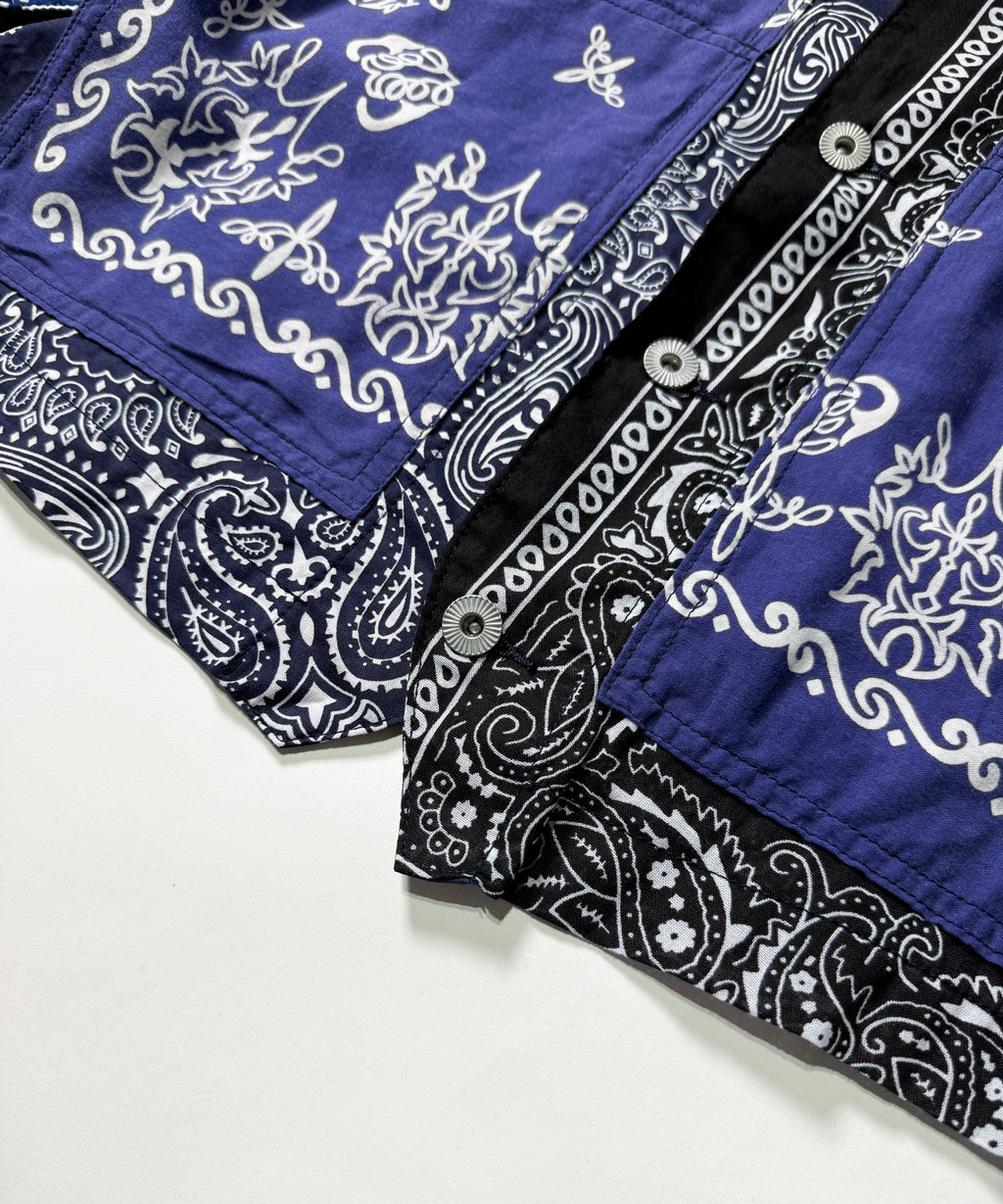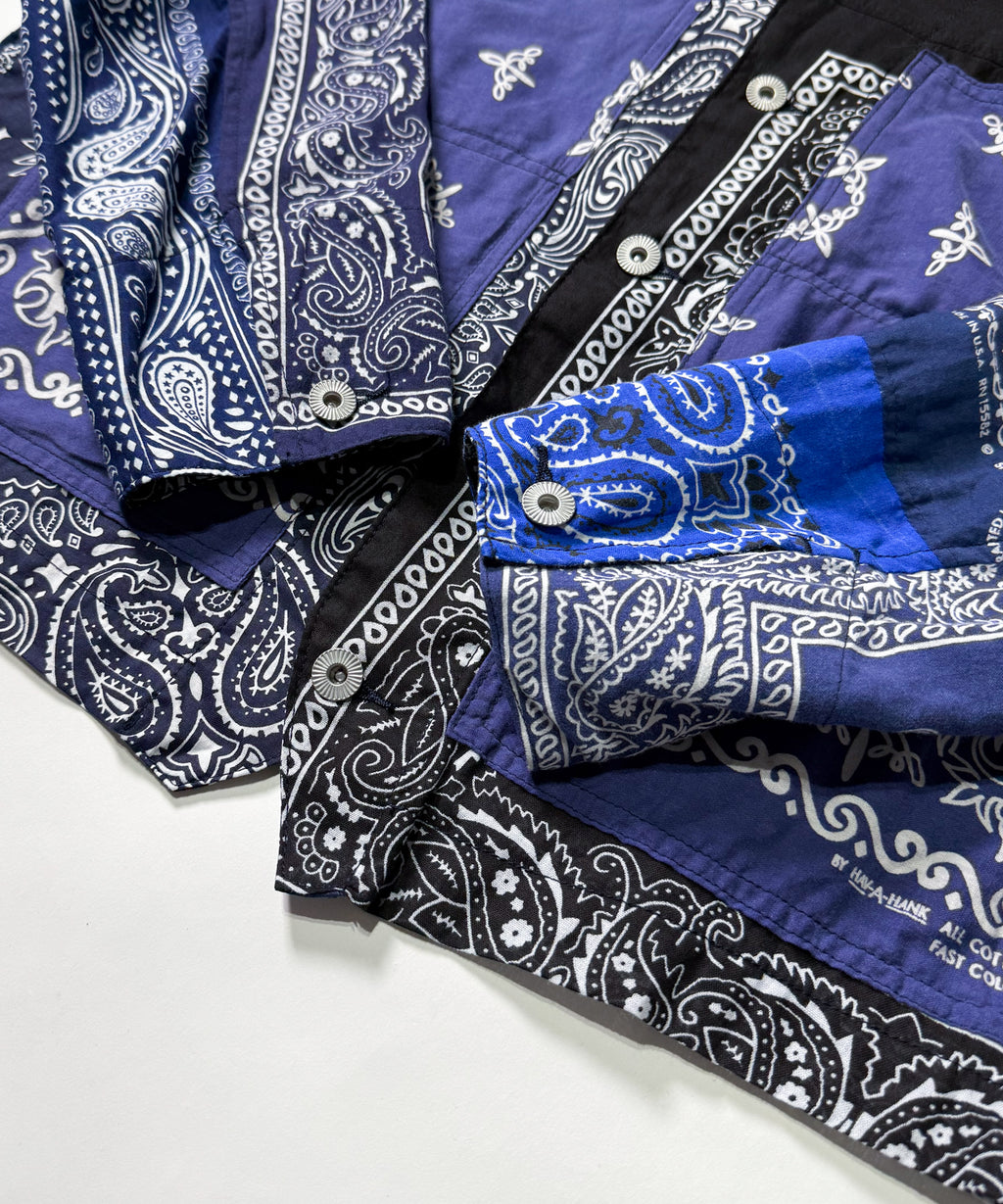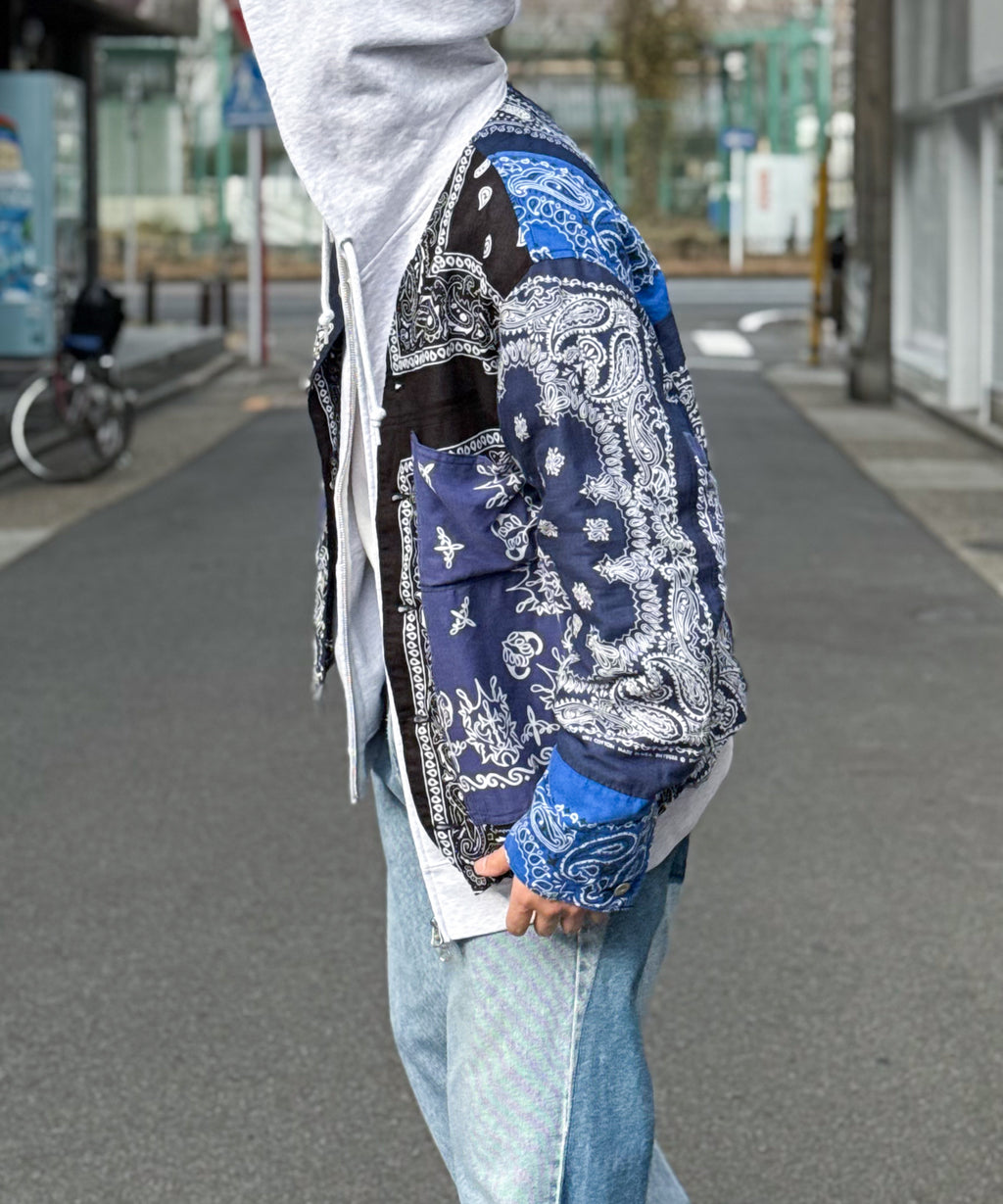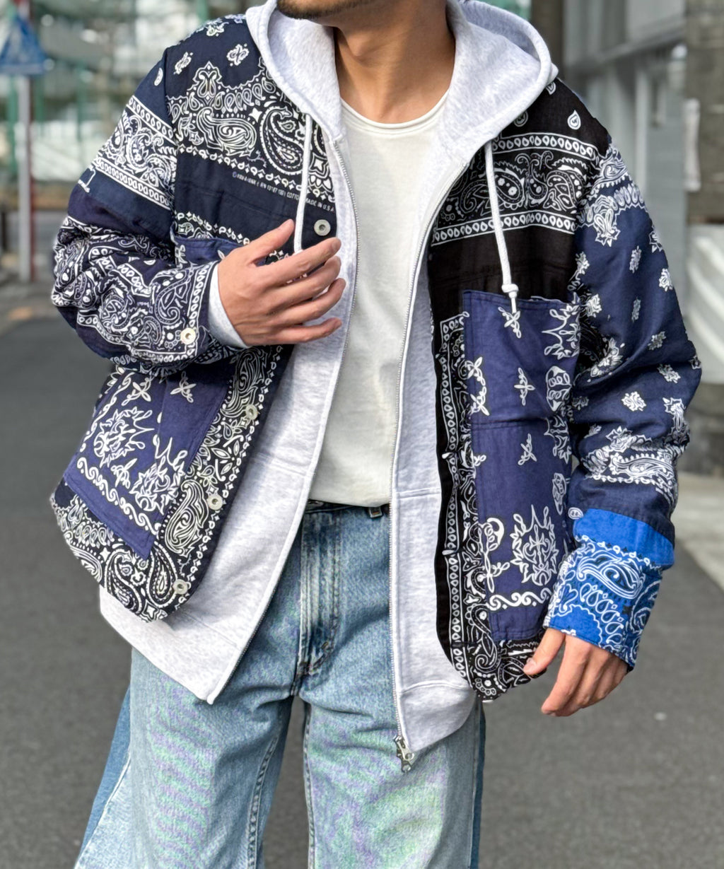 大小さまざまな柄や色味のヴィンテージバンダナを大胆に組み合わせた構成。