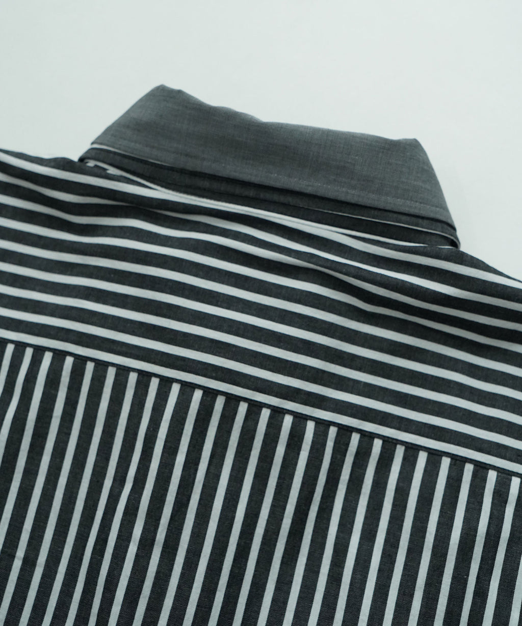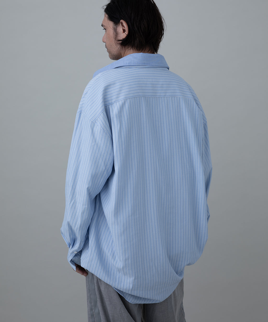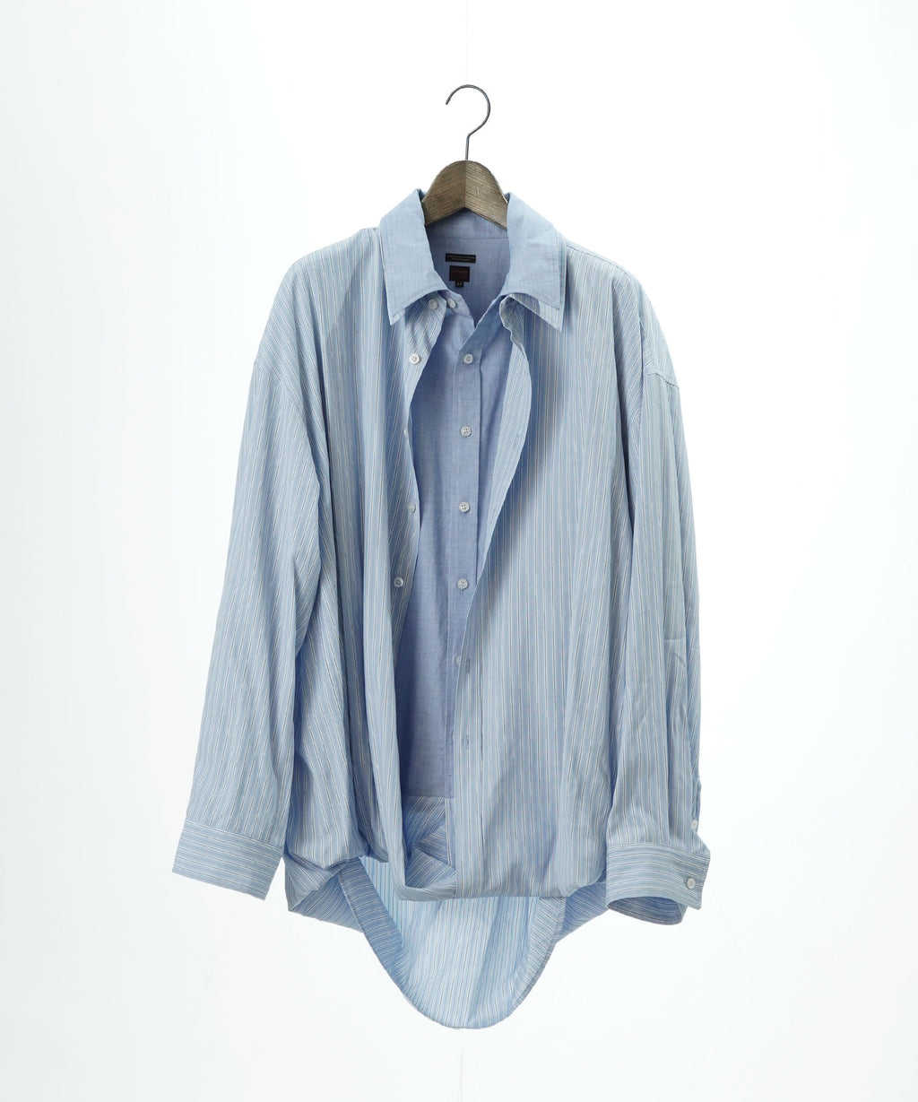 メンズのフォーマル系ストライプシャツ2枚を立体的に繋ぎ合わせた個性的なレイヤードシャツです。かなり個性的なデザインでありながら、品のある素材感がデザインの強さを適度に中和し、着用しやすいバランスを実現しています。フロントフルオープンでの着用から、1~2個のボタンを軽く留めたリラックスした着こなしまで、様々なスタイリングが楽しめる汎用性を持っています。この立体的な複雑なパターン構造により、一枚で複雑なレイヤードスタイルを完成させることができ、コーディネートの幅を大きく広げます。デニムやミリタリーパンツ、ワークパンツなどカジュアルなボトムスと合わせ、着崩したコーディネートでの着用などおすすめです。フォーマル系ストライプの持つ上品さと、立体的な構造が生み出すモダンな印象が絶妙に調和し、他にはない独特の存在感を放っています。