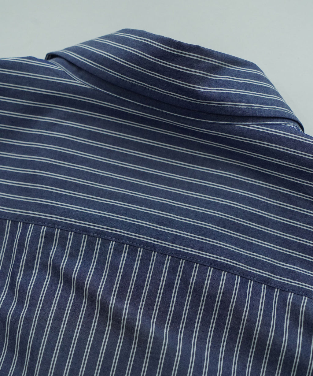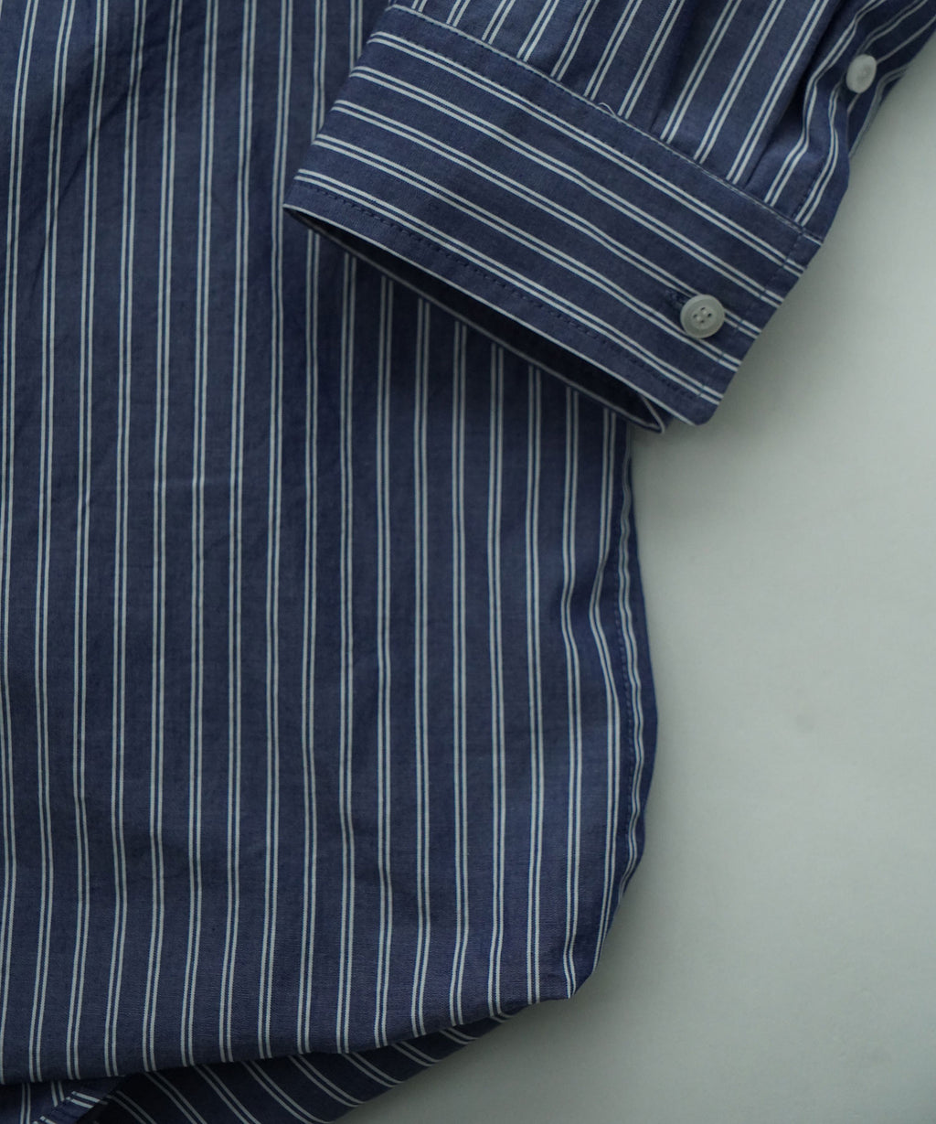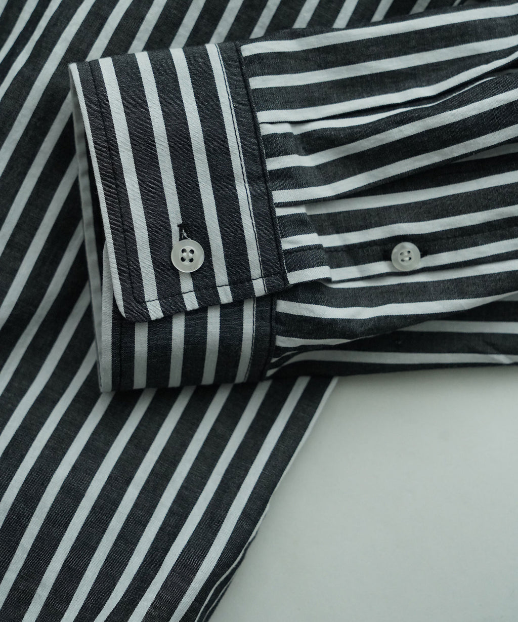 メンズのフォーマル系ストライプシャツ2枚を立体的に繋ぎ合わせた個性的なレイヤードシャツです。かなり個性的なデザインでありながら、品のある素材感がデザインの強さを適度に中和し、着用しやすいバランスを実現しています。フロントフルオープンでの着用から、1~2個のボタンを軽く留めたリラックスした着こなしまで、様々なスタイリングが楽しめる汎用性を持っています。この立体的な複雑なパターン構造により、一枚で複雑なレイヤードスタイルを完成させることができ、コーディネートの幅を大きく広げます。デニムやミリタリーパンツ、ワークパンツなどカジュアルなボトムスと合わせ、着崩したコーディネートでの着用などおすすめです。フォーマル系ストライプの持つ上品さと、立体的な構造が生み出すモダンな印象が絶妙に調和し、他にはない独特の存在感を放っています。