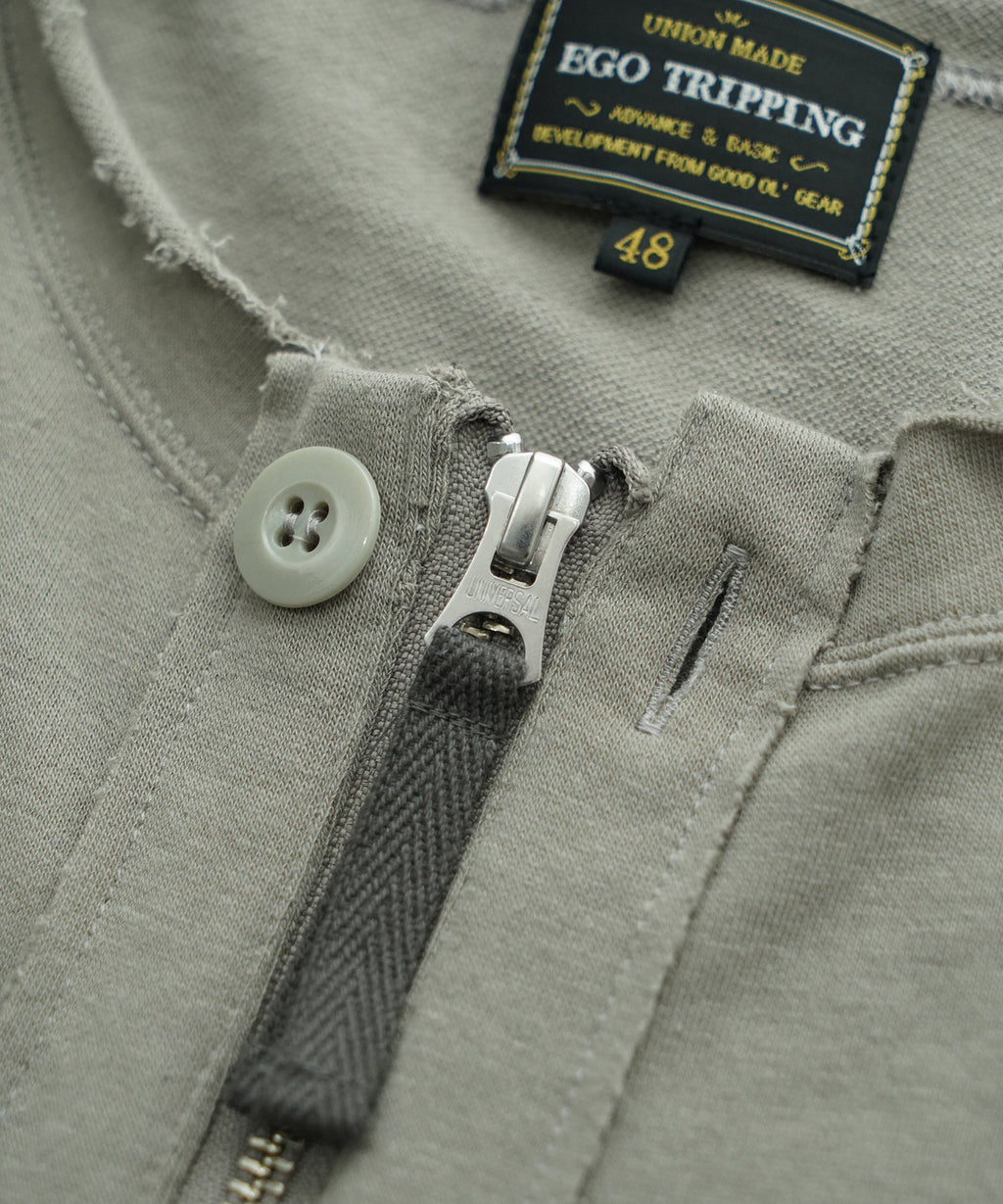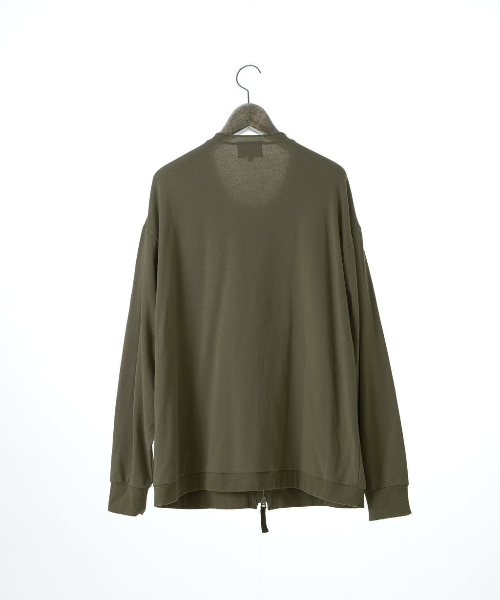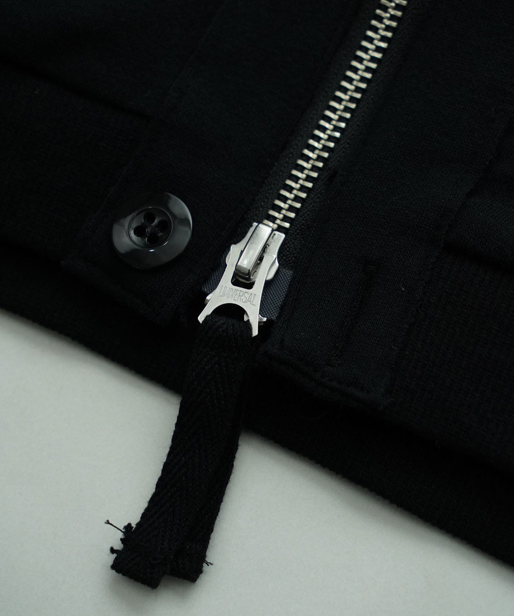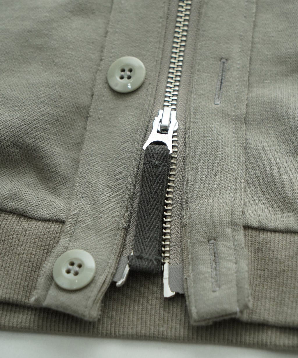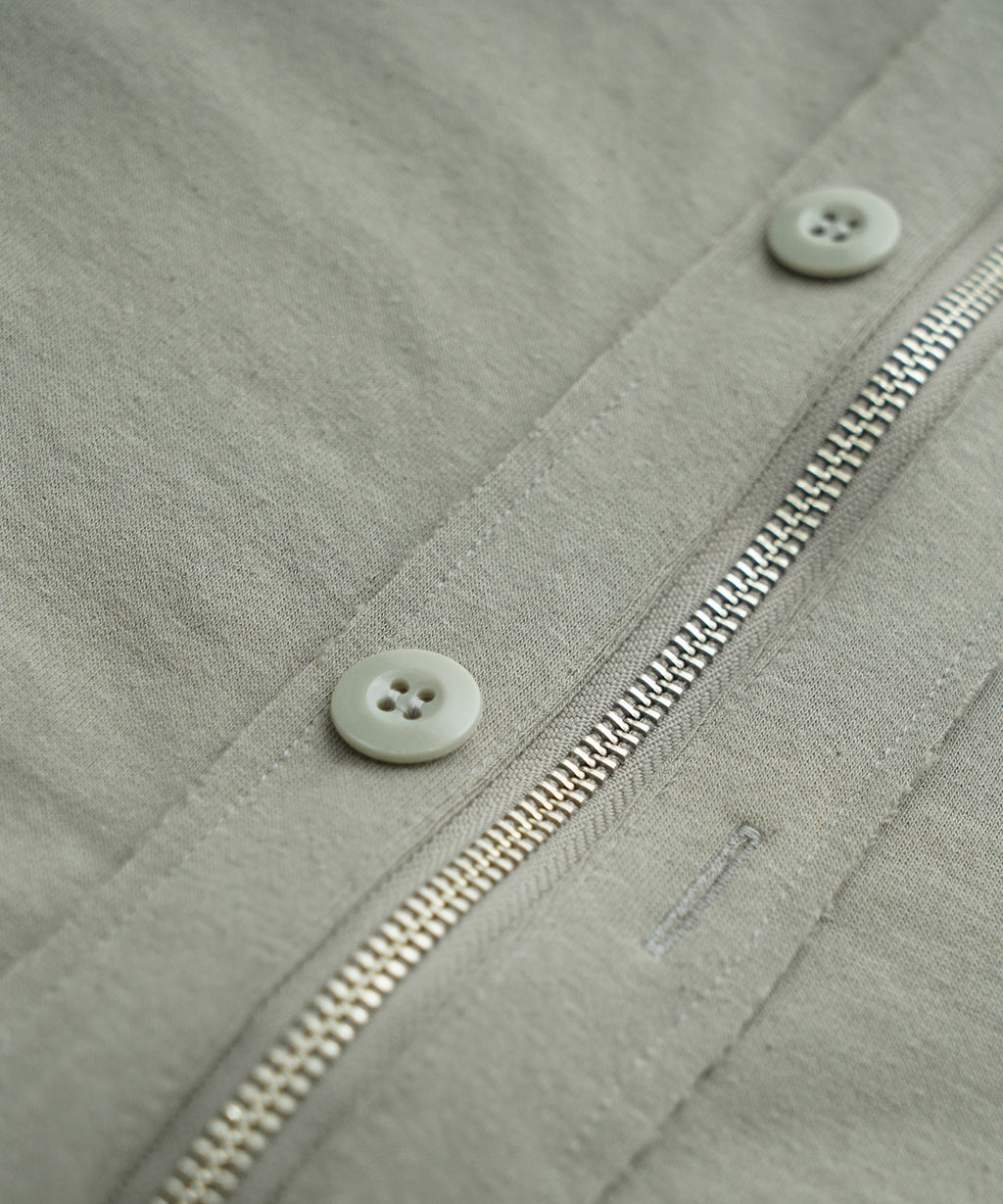 この工夫により、カジュアルでありながらも洗練された印象を与え、春の立ち上がりから長い期間にわたって活躍するアイテムに仕上がりました。前開きはZIPでもボタンでも開閉できる仕様になっています。
