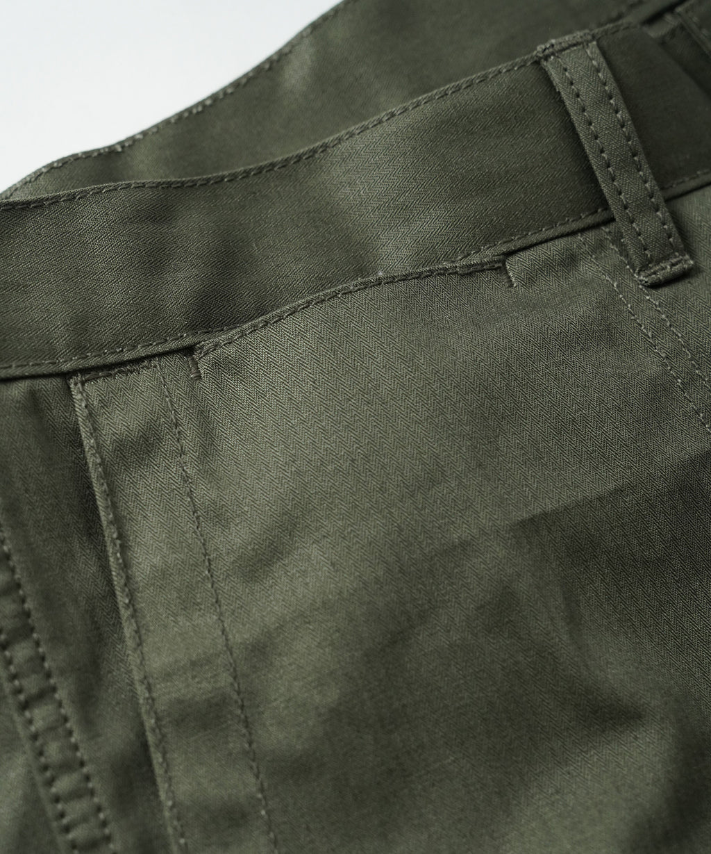 度を詰めて高密度に織り上げたミリタリーへリンボーン生地は、触れた瞬間から明らかなハリとコシが全身に緊張感を与え、着込むほどに体へと馴染んでいく独特の感触が魅力です。