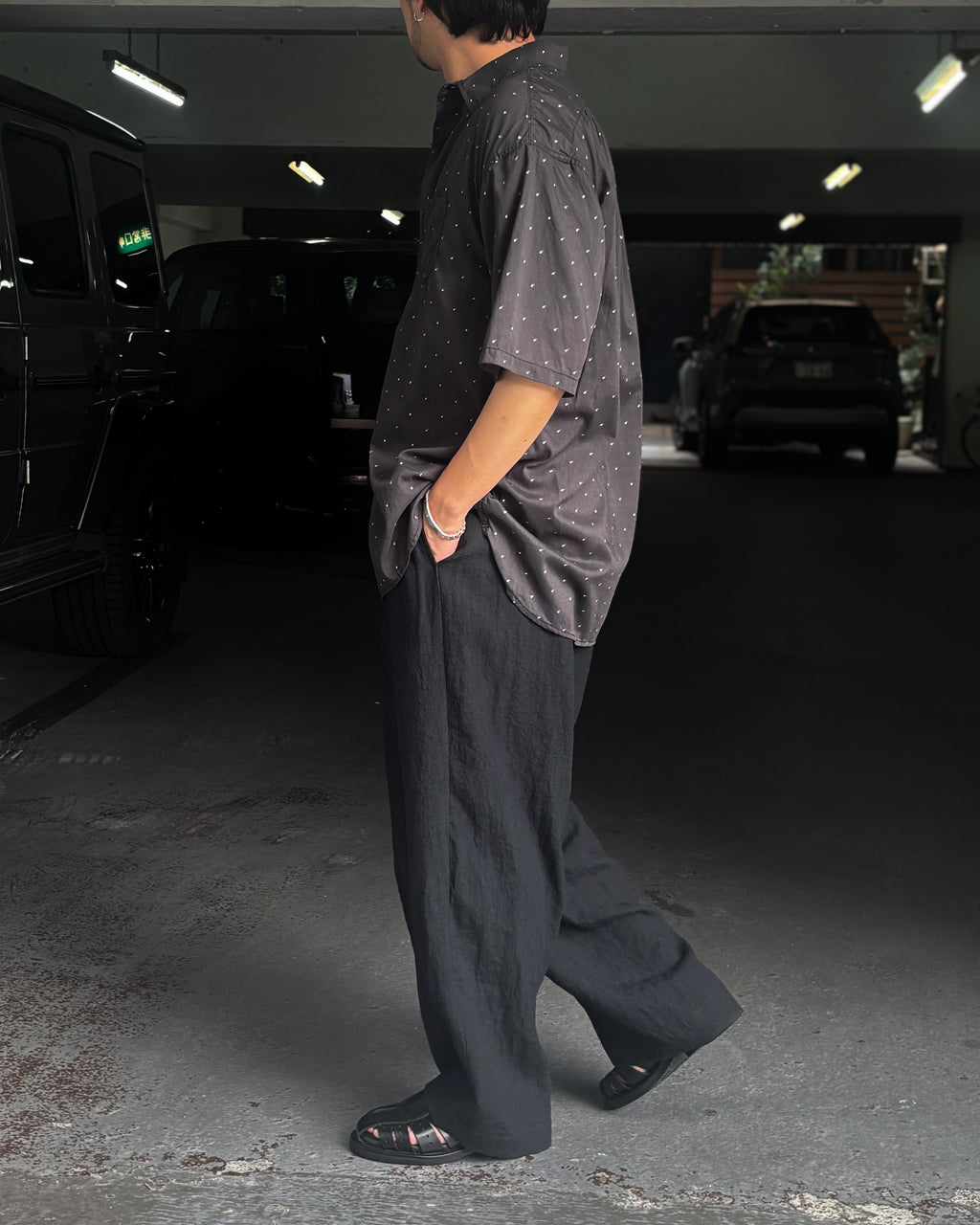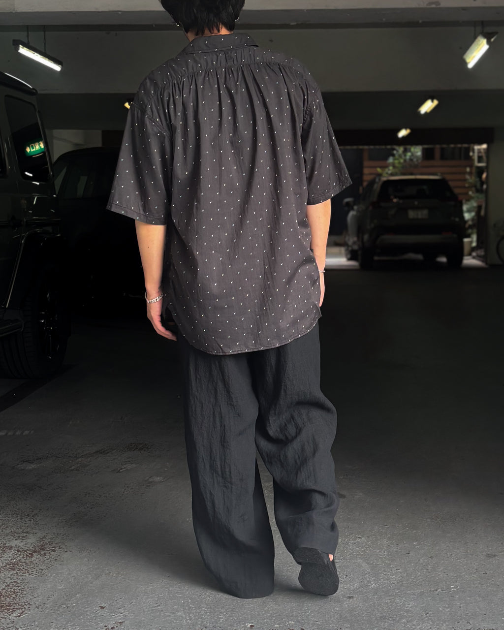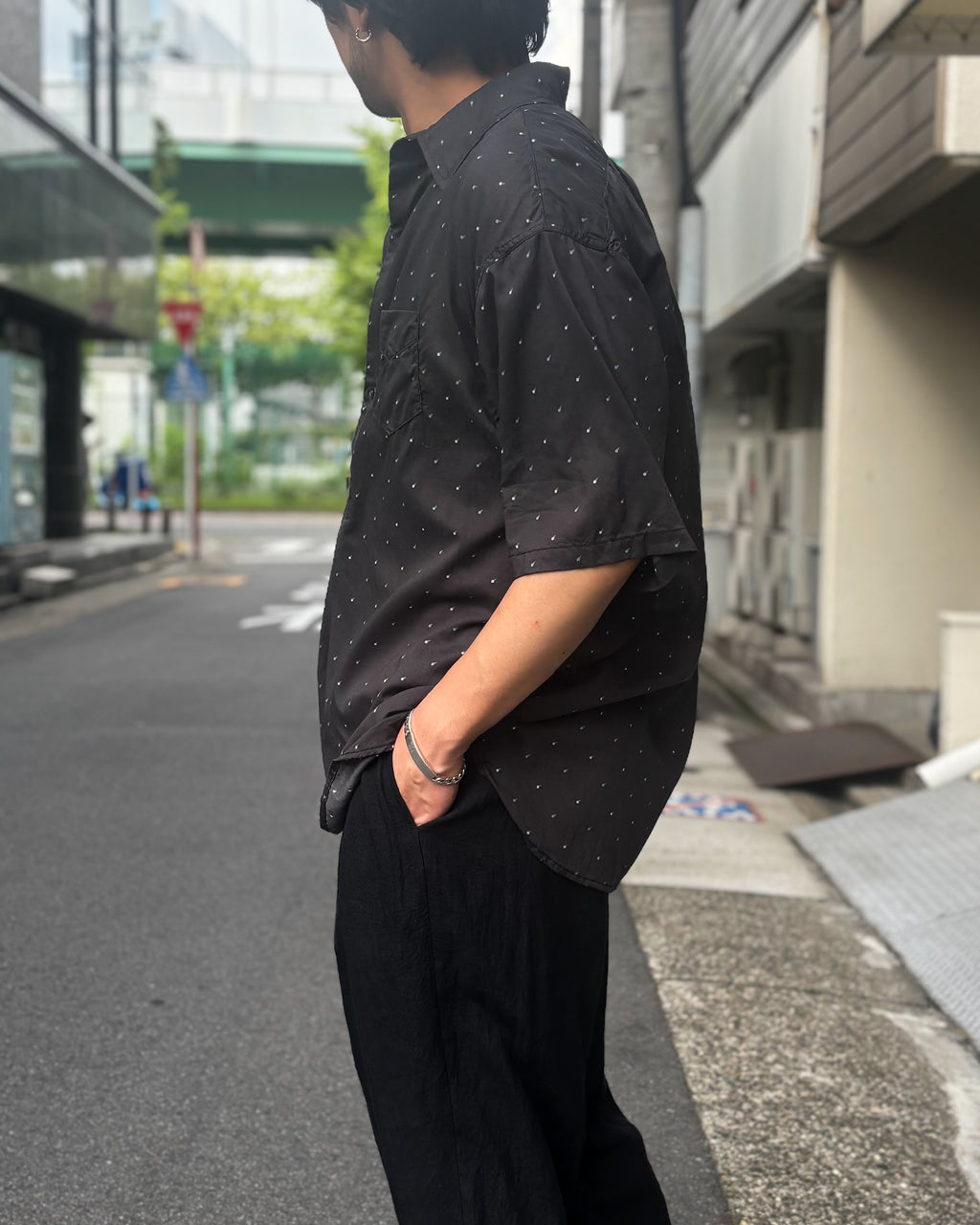 素材はテンセルコットンの若干の光沢感と落ち感のあるベース生地に、50年代のアメリカのプリントシャツをサンプリングした柄を使用しました。