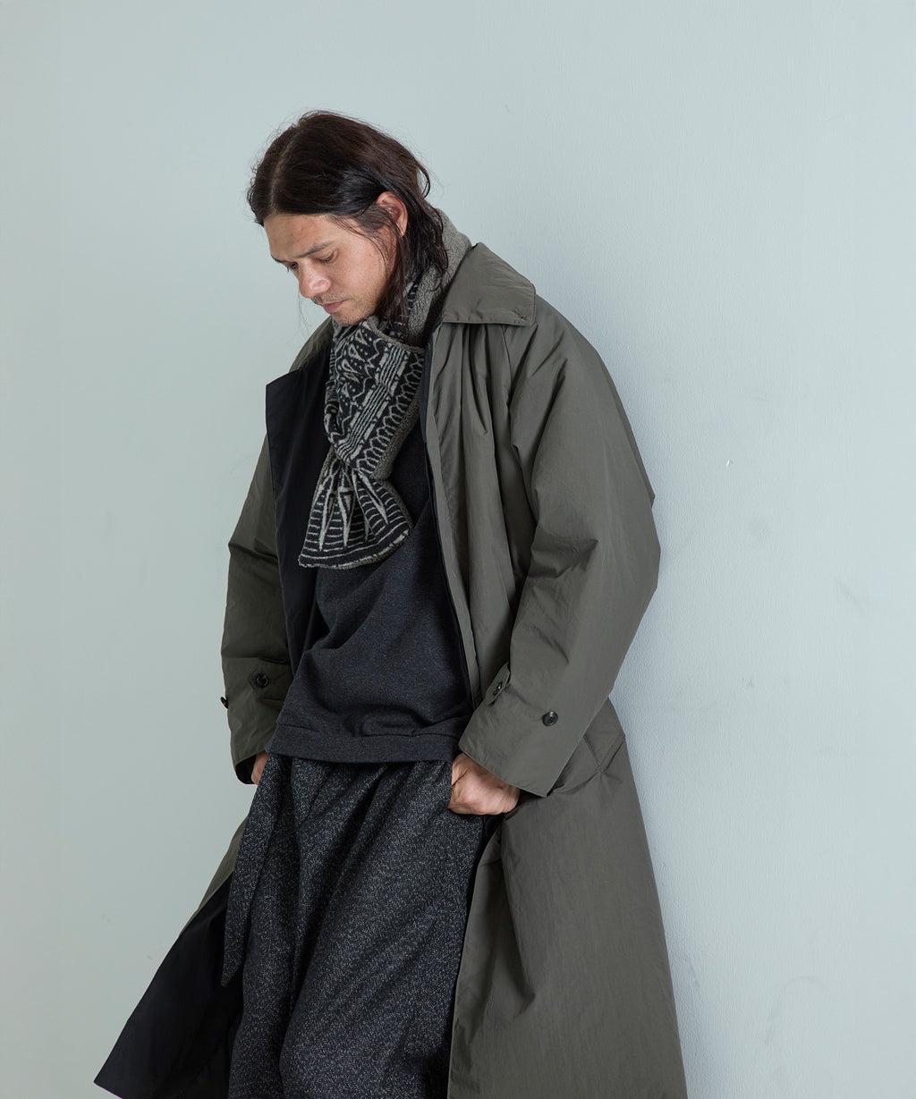 80年代のヴィンテージコートを彷彿とさせる某ブランドのバルマカンコートをベースにしながらも、スッキリとしたデザインと肩のラインが美しく落ちるワンパネルスリーブという古い時代性を加えることで、ノスタルジックでありながら新鮮な魅力を放ちます。