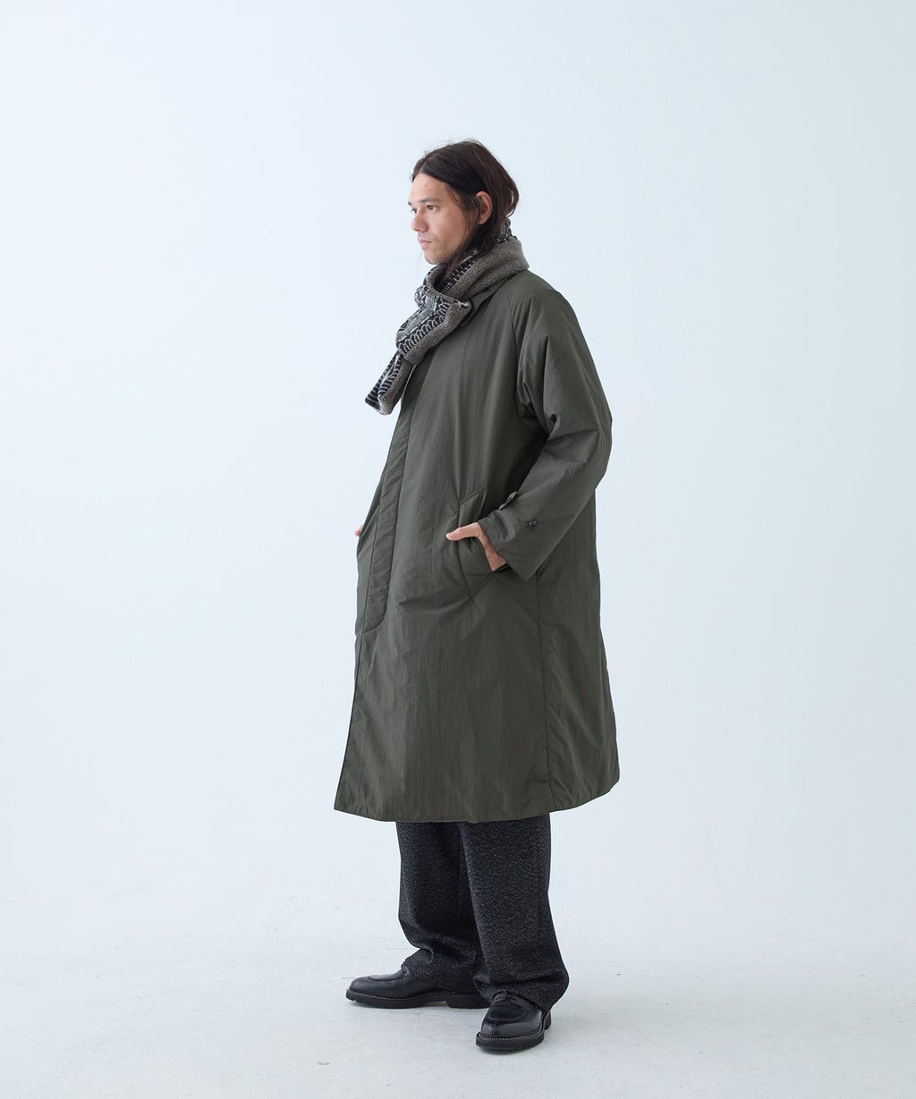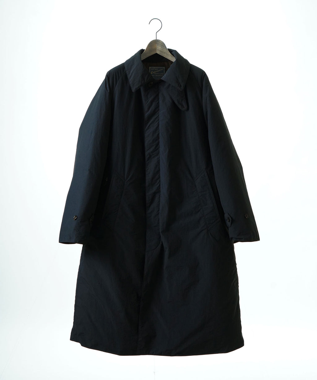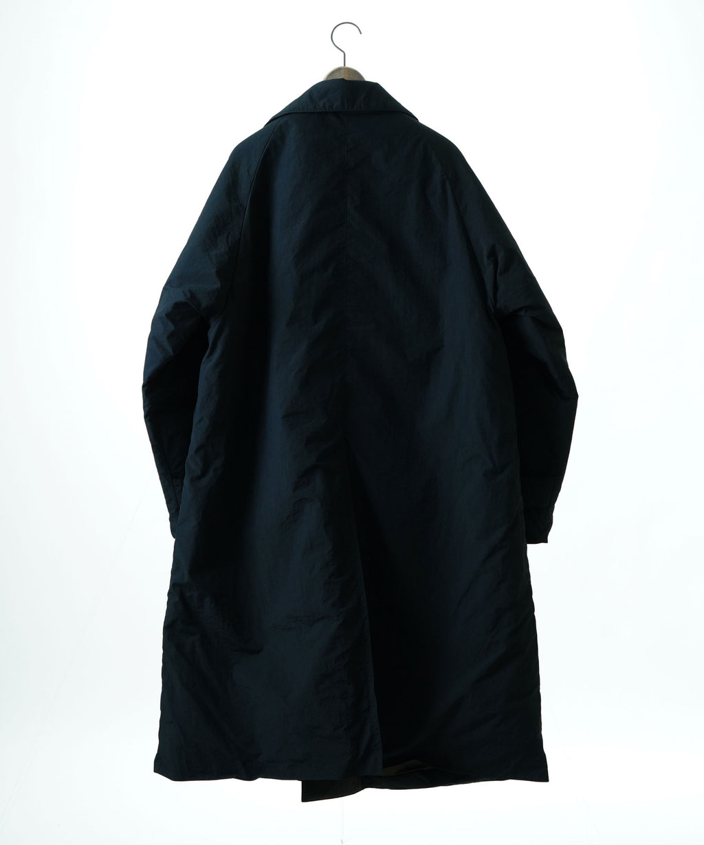 従来のロングコートの暖かさを享受しながらも、その最大の欠点である重さを解消するべく、軽い中綿仕様で仕立てたバルマカンコート。