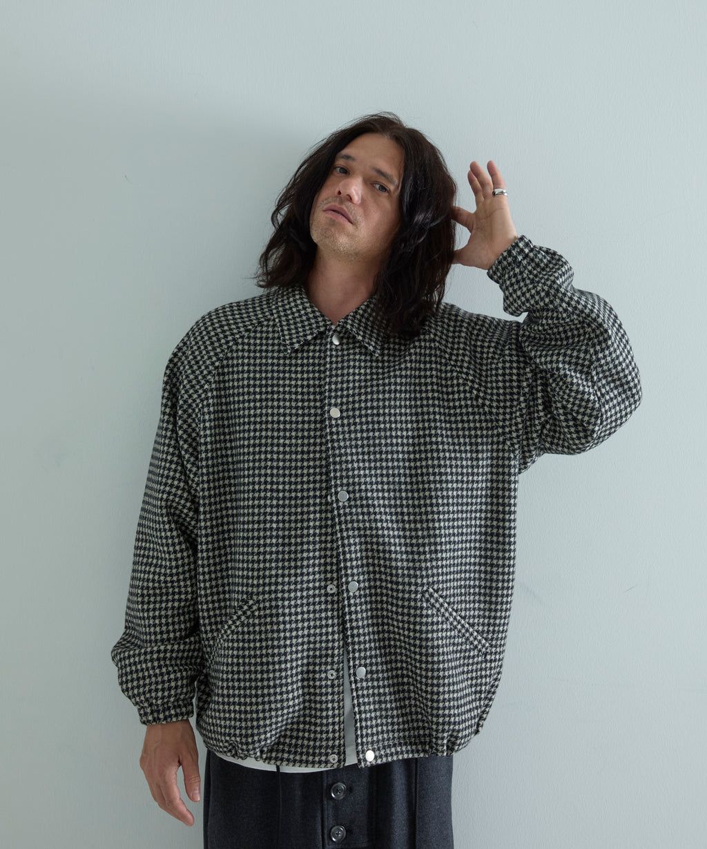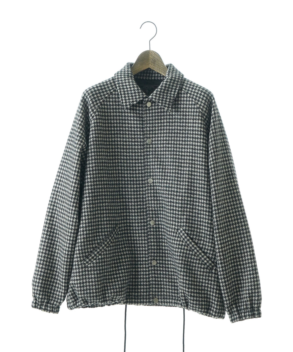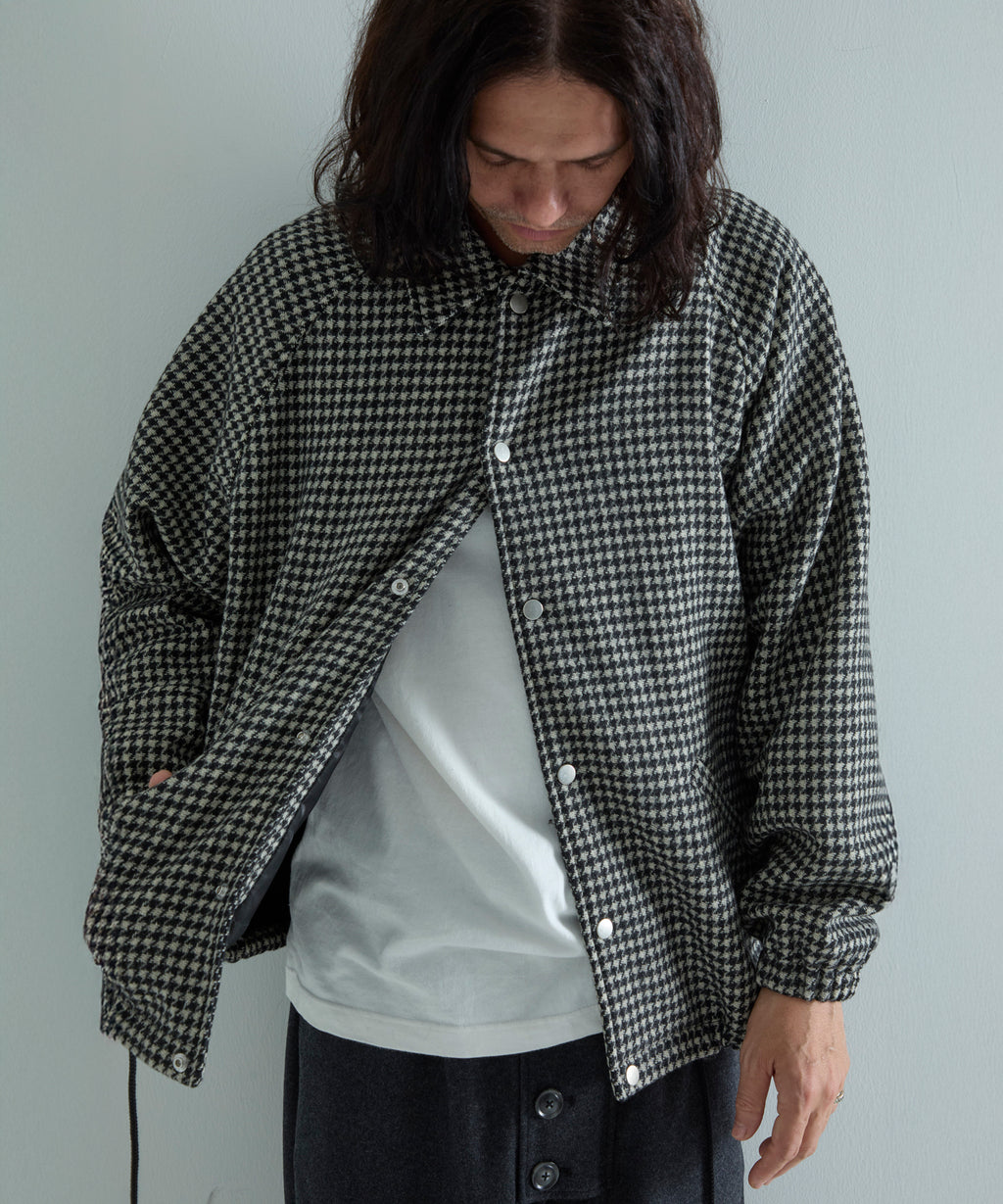 一般的に高級感を演出する千鳥格子のウール素材を、スポーツカジュアルの代表格であるコーチジャケットのシルエットで仕立てるという意表を突く組み合わせが、このジャケットの最大の特徴です。