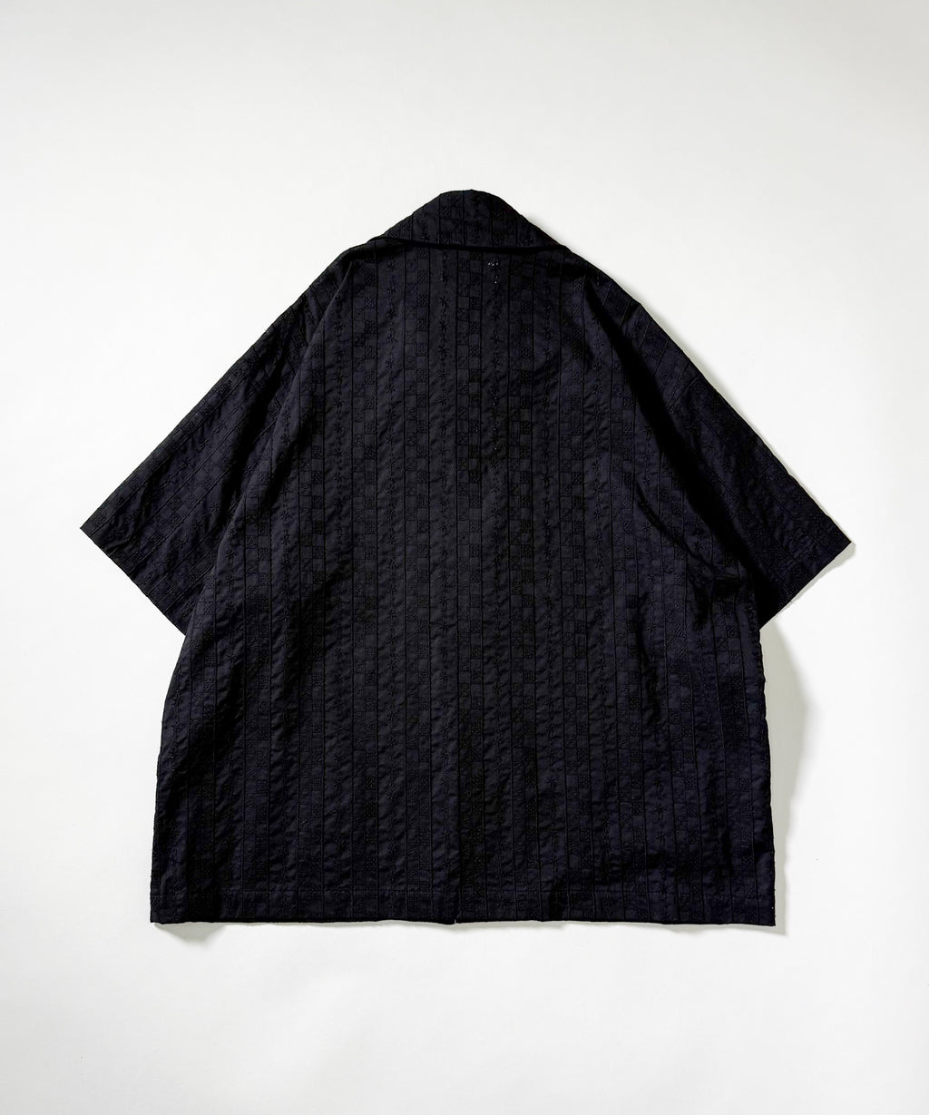 薄手のローン地に刺繍を施した素材に、odd_本人によるドローイングで描かれた大きな花をレース生地を用いてパネル刺繍でアウトプットしたアイテム。