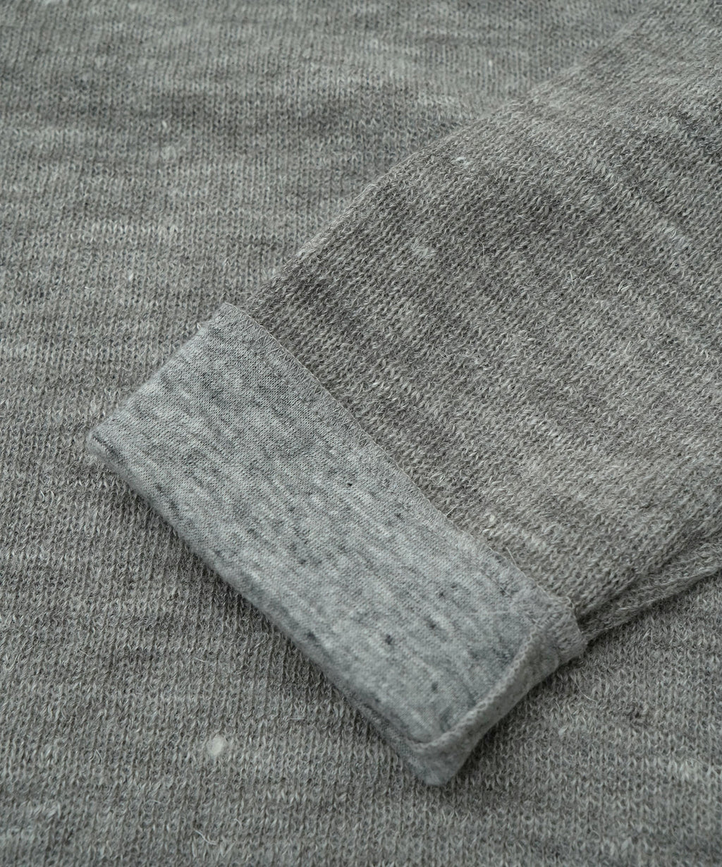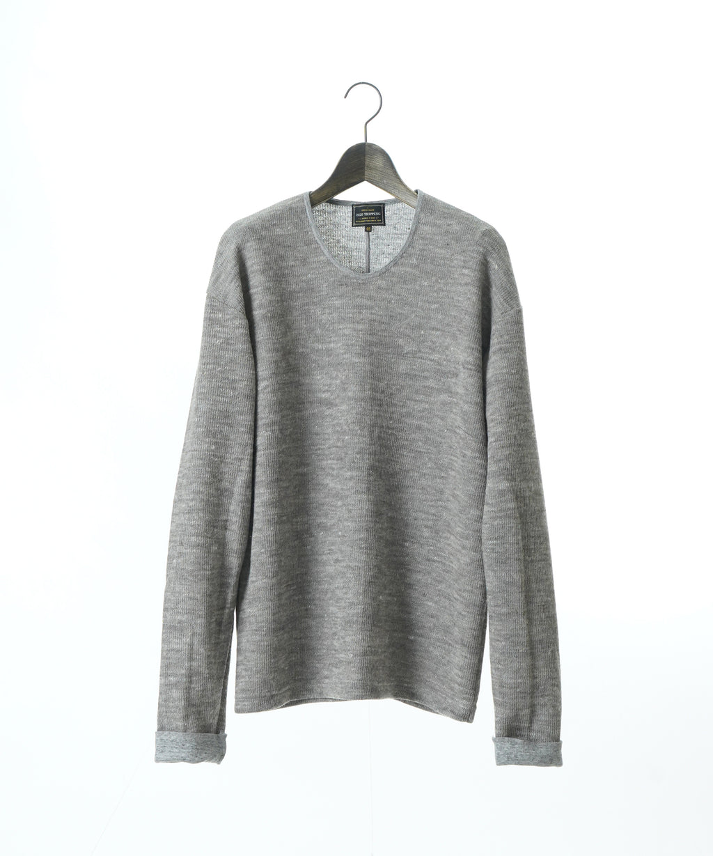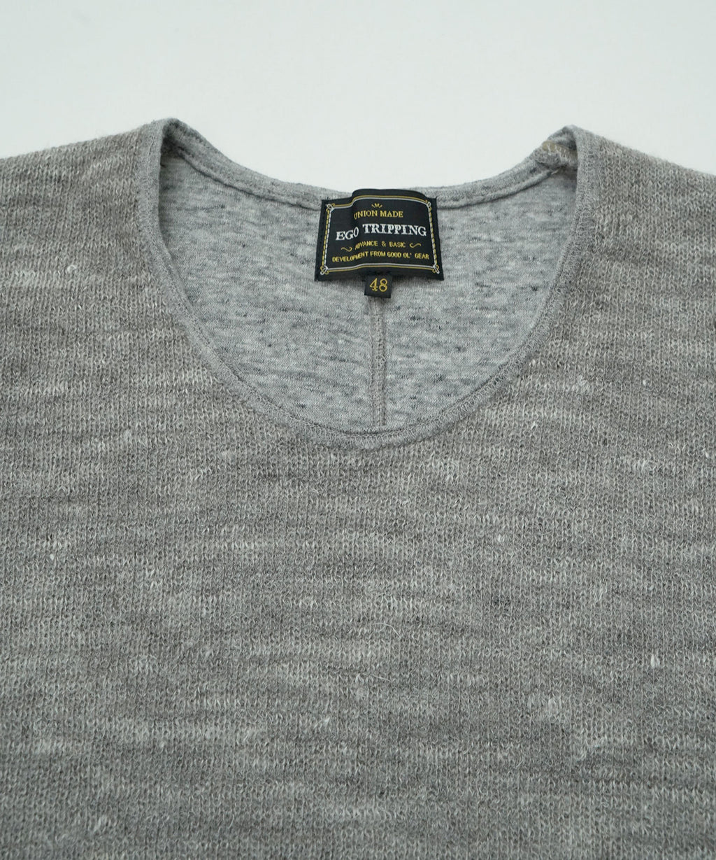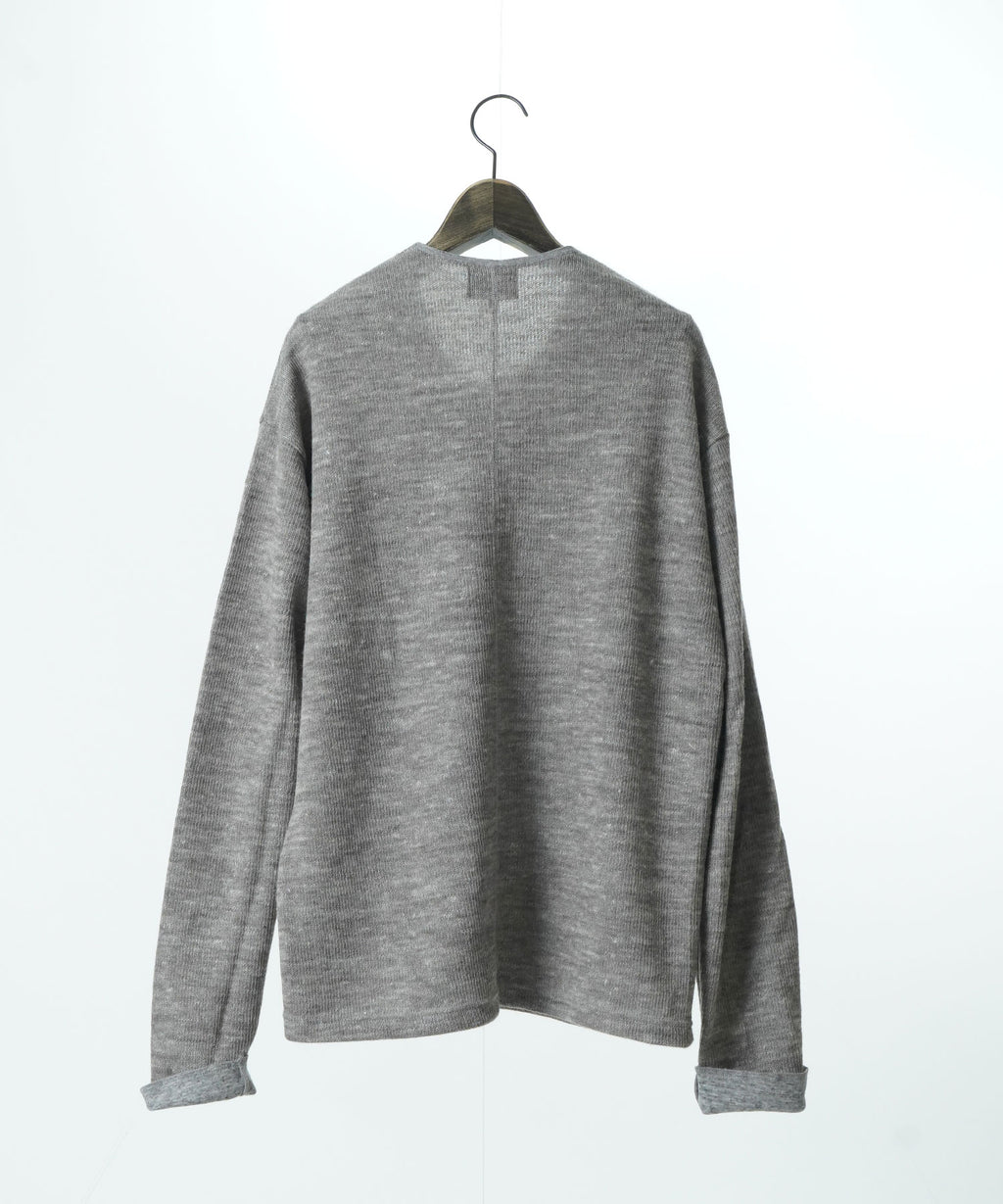 また、ネックラインの断ち切り仕様は、カジュアルながらも洗練された印象を与え、あえて長めに設計された袖はロールアップすることで、さりげないアクセントとなります。