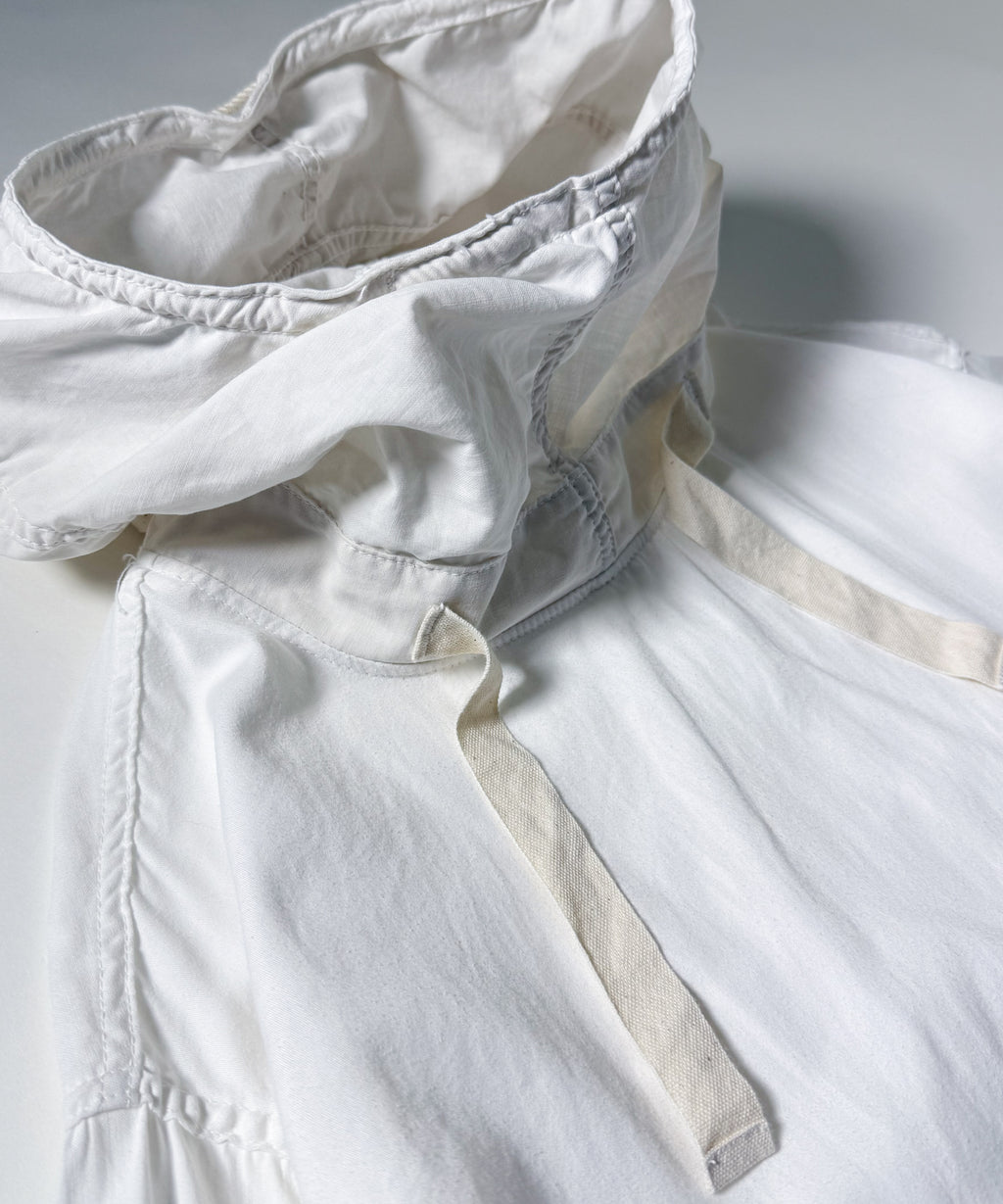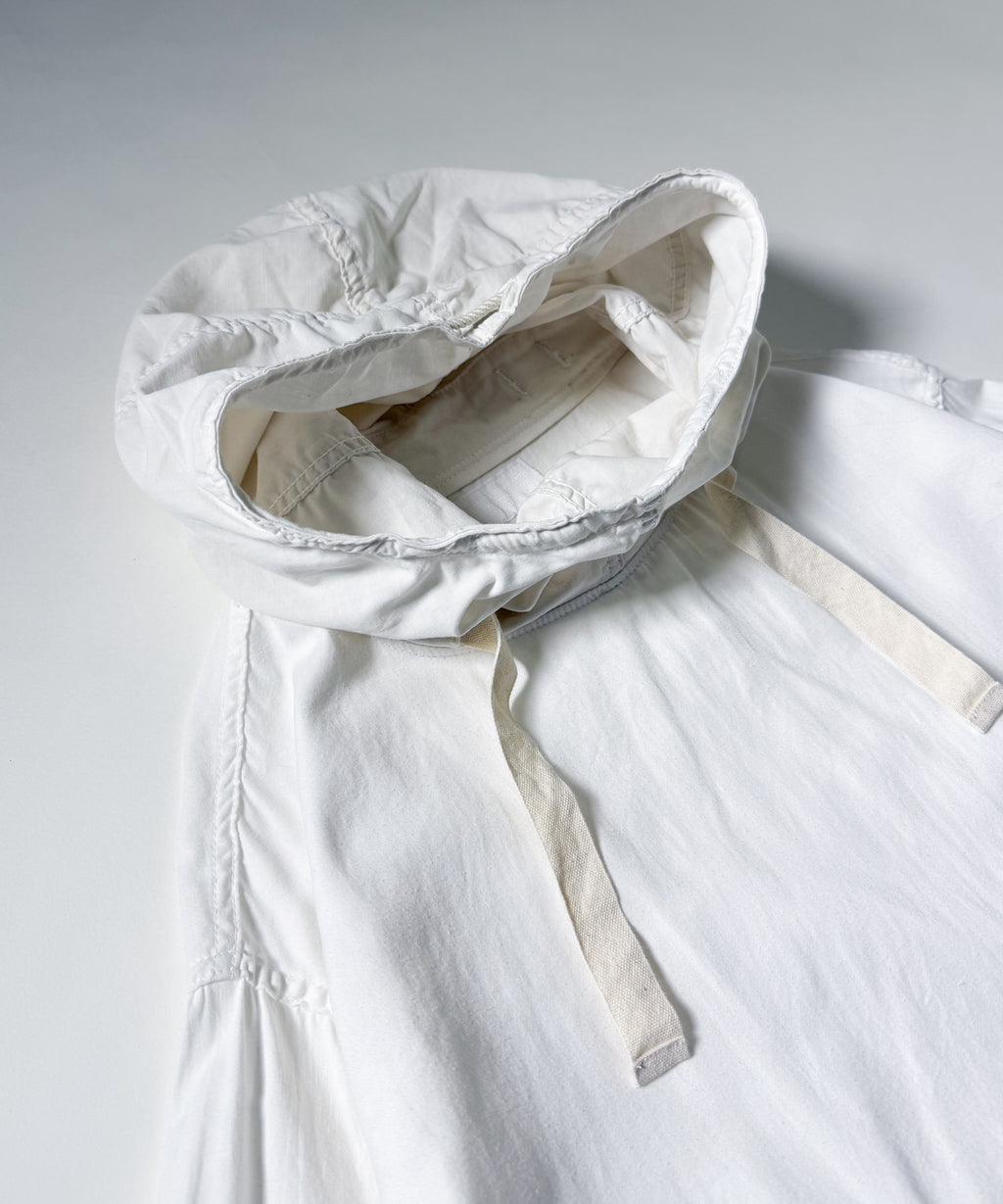 高めに設定されたネックと立体的なフード、プルオーバー仕様によるミニマルなデザインが特徴。