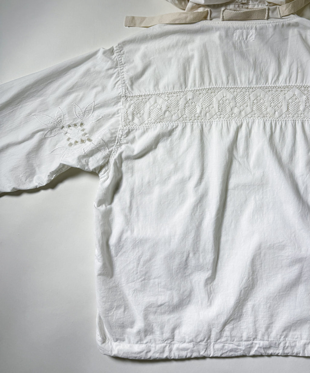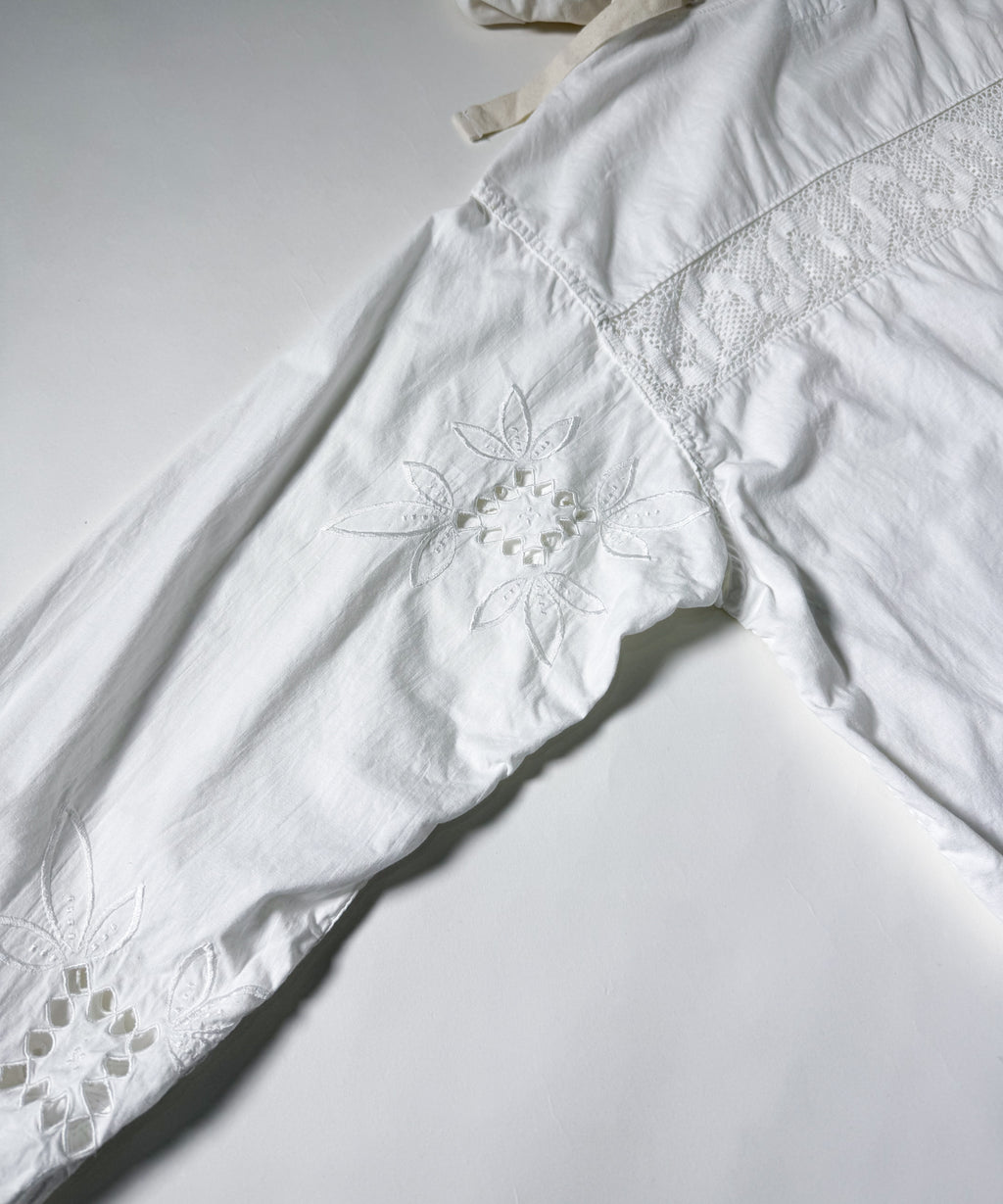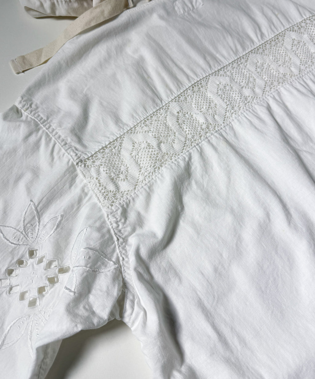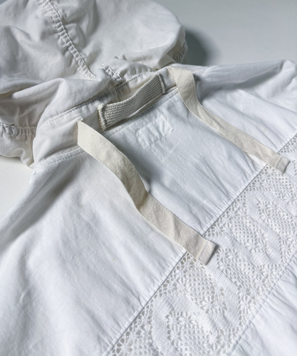 当時特有の繊細な刺繍やレースワークが随所に施され、1点ごとに異なる表情を持ちます。